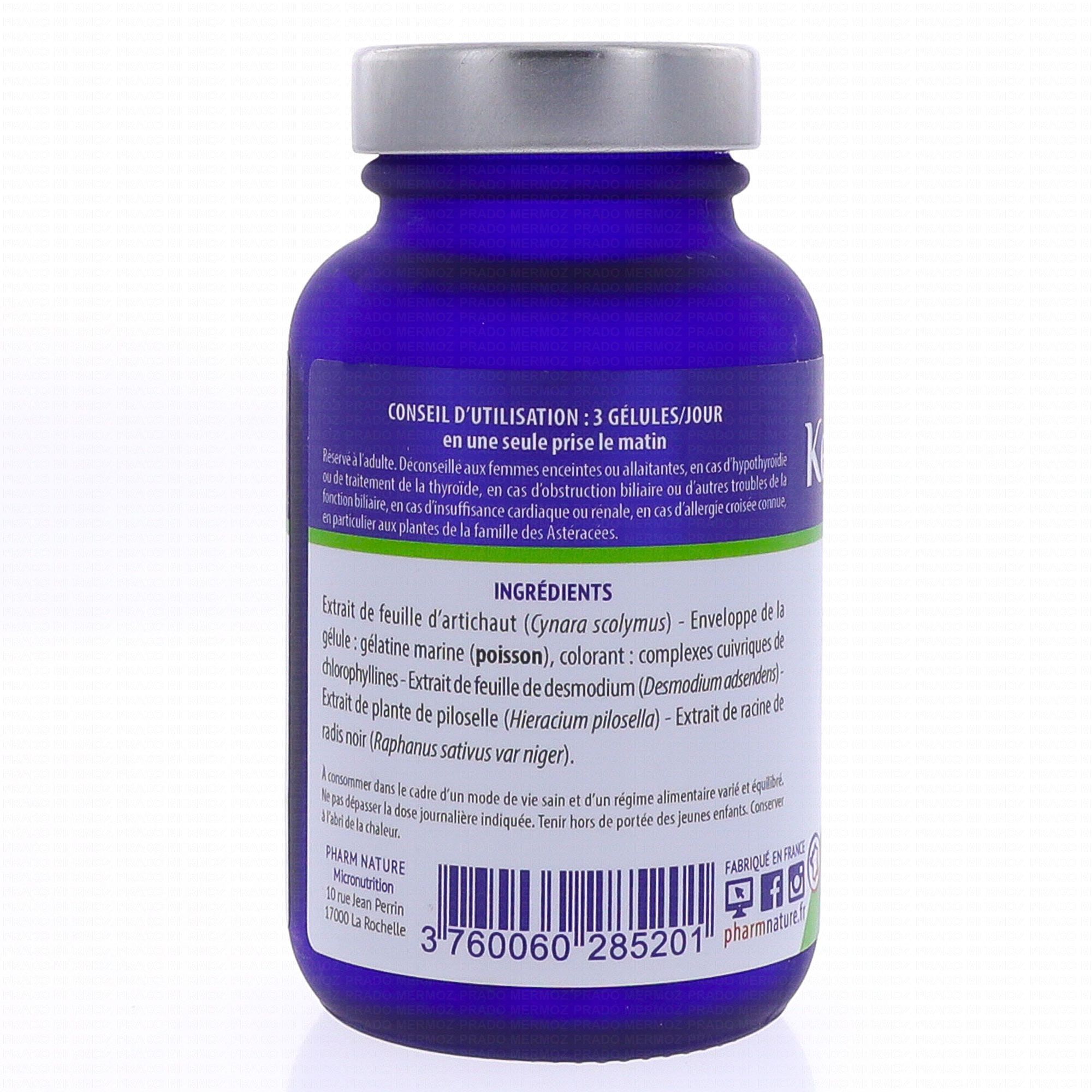 Extrait de feuilles d'artichaut (Cynara scolymus), enveloppe de la gélule : gélatine marine, extrait de plantes de desmodium (Desmodium adsendens), extrait de plantes de piloselle (Hieracium pilosella), radis noir (Raphanus sativus var niger) racine.