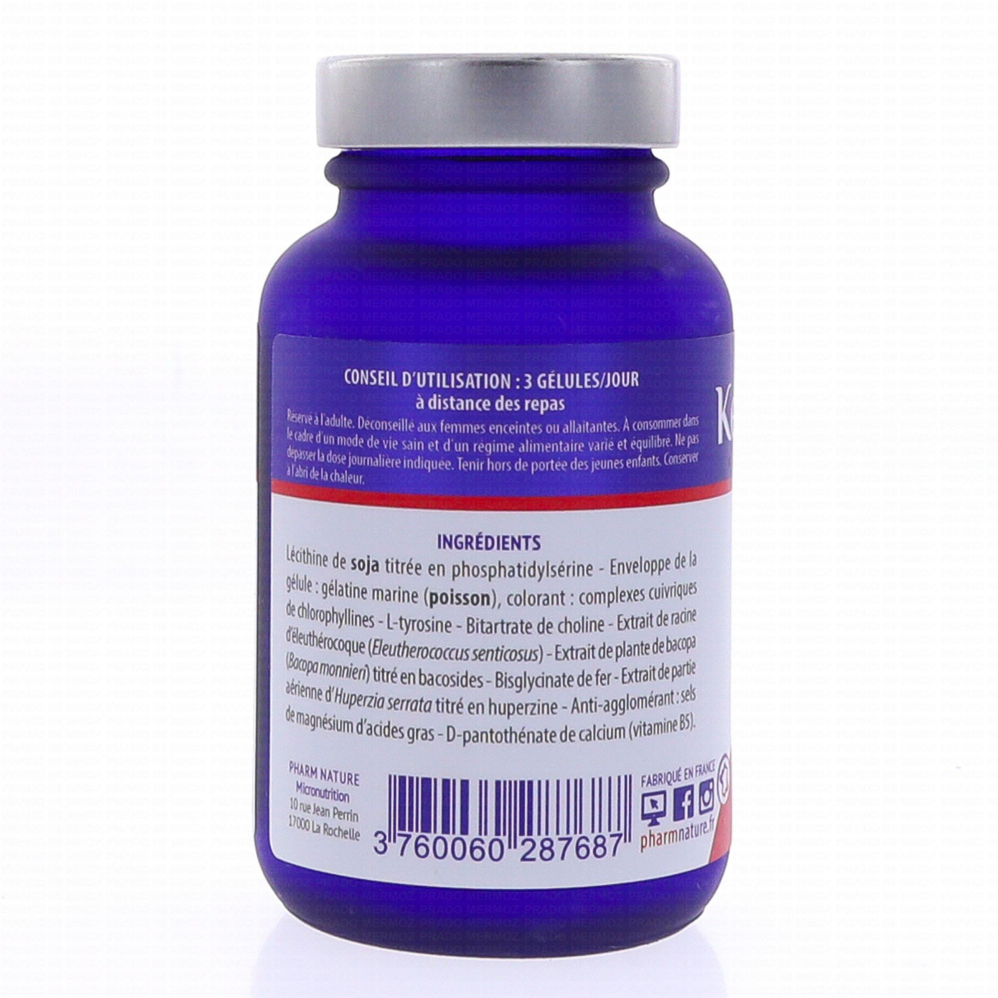 L-tyrosine 250 mg, Extrait de racine d'éleuthérocoque (Eleutherococcus senticosus) 100 mg soit 400 mg*, Extrait de plante de bacopa (Bacopa monnieri) 80 mg, soit 2 g* dont bacosides 16 mg, Phosphatidylsérine de soja 60 mg, Choline 40 mg, Extrait d'Huperzia serrata 30 mg dont huperzine 60 µg, Bisglycinate de fer 12,6 mg/90%**, Vitamine B5 2,28 mg/38%**. Tunique : gélatine marine.