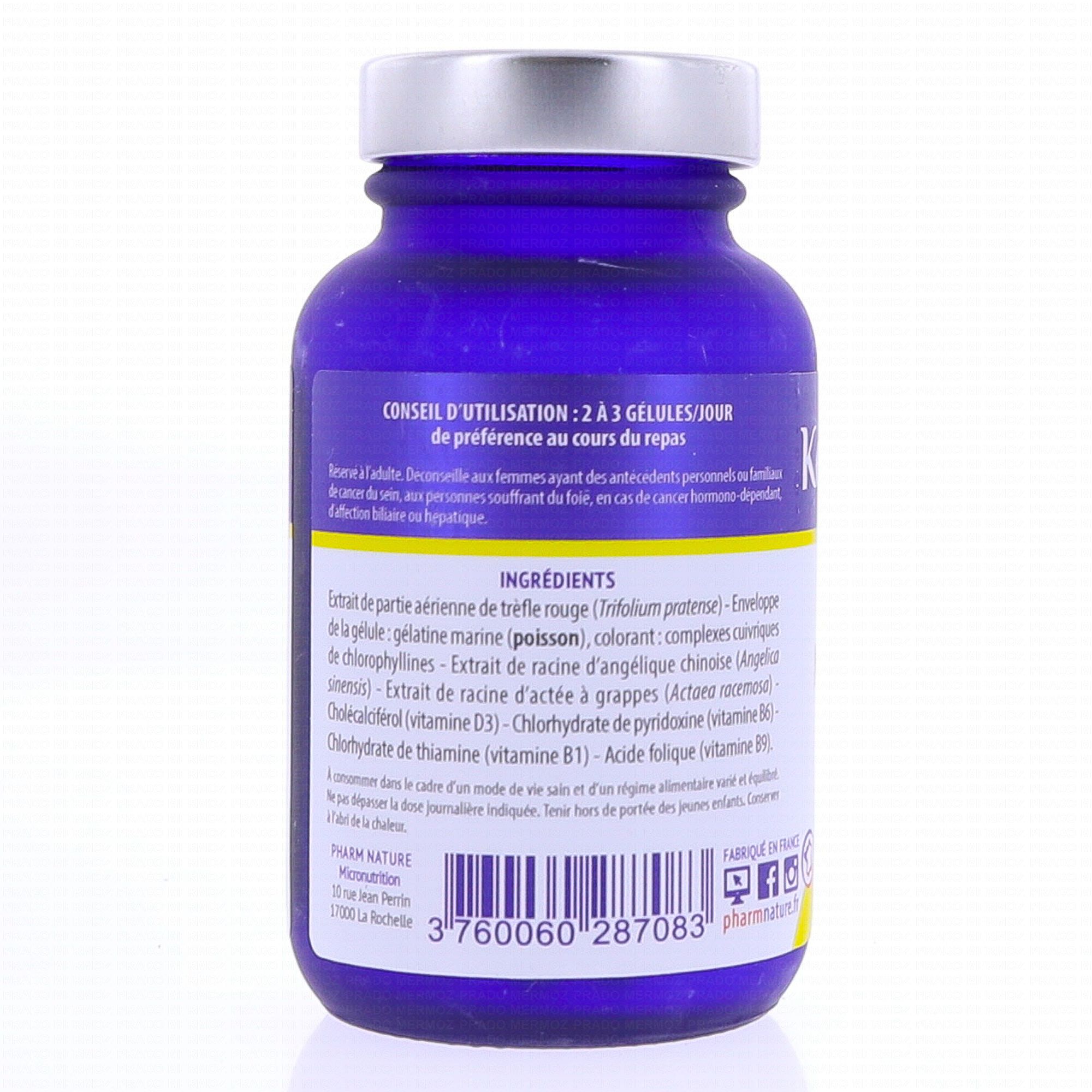 Extrait de partie aérienne de trèfle rouge (Trifolium pratense) – Enveloppe de la gélule : gélatine marine (poisson), colorant : complexes cuivriques de chlorophyllines – Extrait de racine d'angélique chinoise (Angelica sinensis) – Extrait de racine d'actée à grappes (Actaea racemosa) – Cholécalciférol (vitamine D3) – Chlorhydrate de pyridoxine (vitamine B6) – Chlorhydrate de thiamine (vitamine B1) – Acide folique (vitamine B9).