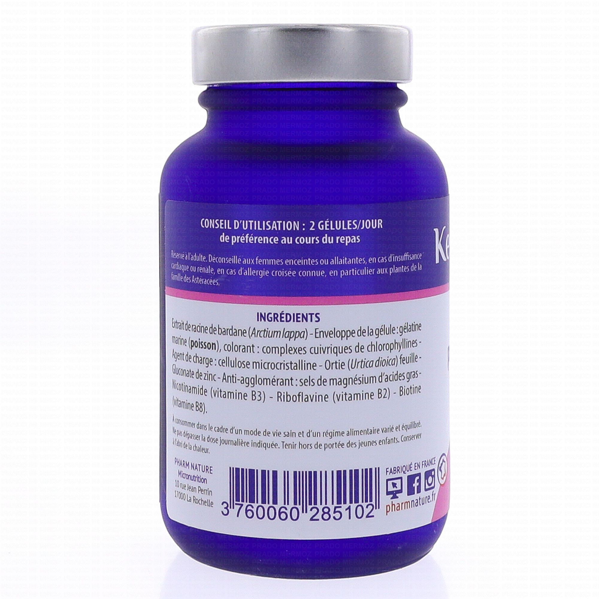 Bardane (Arctium lappa), Enveloppe de la gélule : gélatine marine (poisson), colorant : chlorophylline, Agent de charge : cellulose microcristalline, Ortie (Urtica diocia) feuille, Gluconate de zinc, Anti-agglomérant : stéarate de magnésium, Nicotinamide (vitamine B3), Riboflavine (vitamine B2), Biotine (vitamine B8).