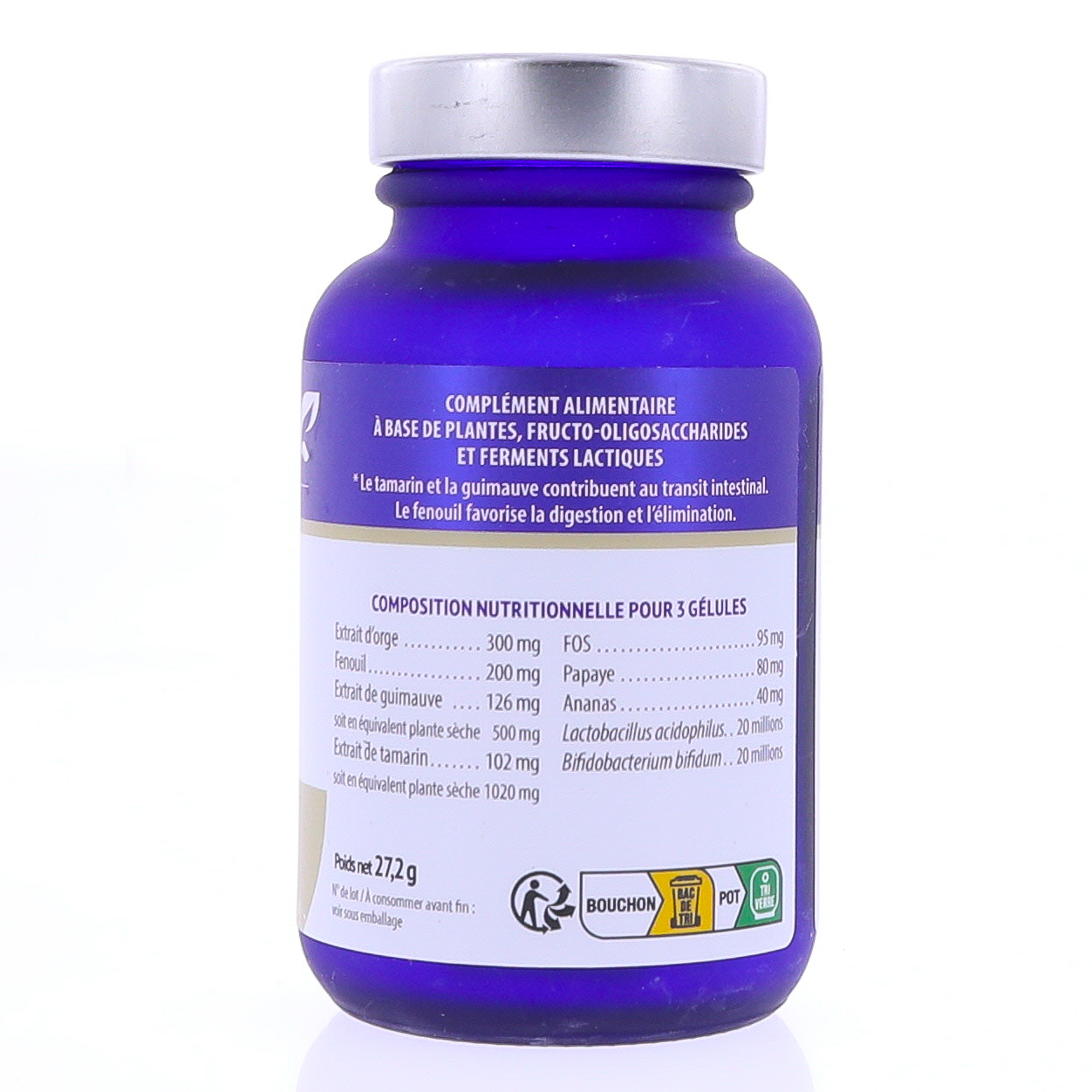 Extrait de son d'orge (Hordeum vulgare L.) – Enveloppe de la gélule : gélatine marine (poisson), colorant : complexes cuivriques de chlorophyllines – Fenouil (Foeniculum vulgare) fruit – Extrait de racine de guimauve (Althaea officinalis) – Fructo-oligosaccharides – Extrait de pulpe de tamarin (Tamarindus indica) – Papaye (Carica papaya) fruit – Fibre d'acacia – Farine de noix de coco – Ananas (Ananas sativa) tige – Bifidobacterium bifidum – Lactobacillus acidophilus.