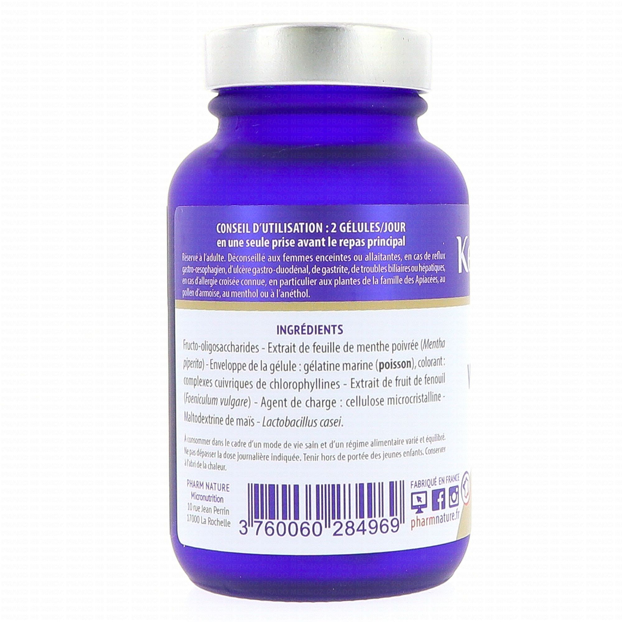 Fructo-oligosaccharides – Extrait de feuille de menthe poivrée (Mentha piperita) – Enveloppe de la gélule : gélatine marine (poisson), colorant : complexes cuivriques de chlorophyllines – Extrait de fruit de fenouil (Foeniculum vulgare) – Agent de charge : cellulose microcristalline – Maltodextrine de maïs – Lactobacillus casei.