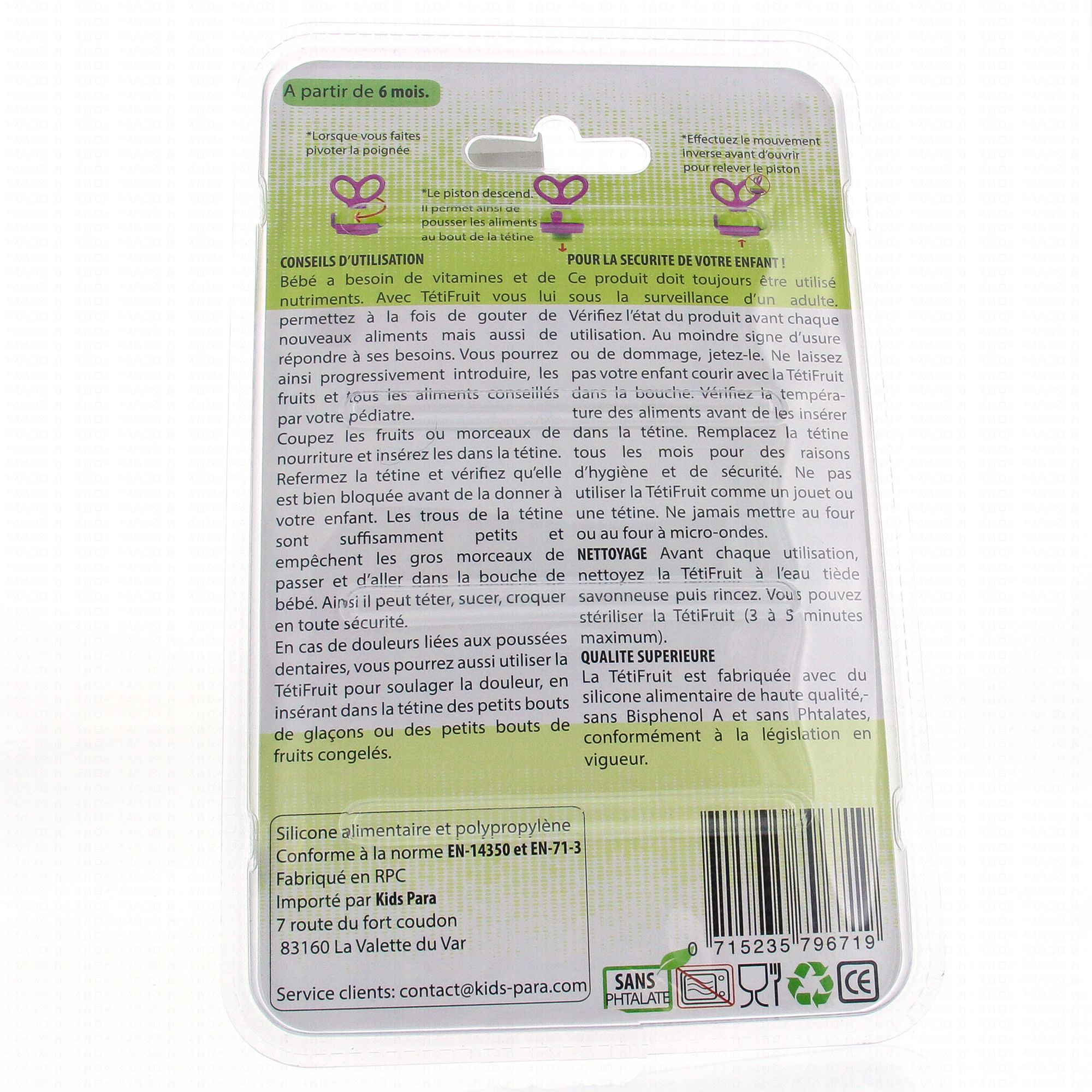 La tétine alimentaire TétiFruit permet de faire gouter à votre enfant de nouveaux aliments tout en lui permettant de mordre la tétine comme un jouet. Le bébé peut alors téter, sucer et jouet avec la TétiFruit. En cas de douleurs liées aux poussées dentaires, la TétiFruit peut aussi s'utiliser pour soulager la douleur en insérant dans la tétine des petits bouts de glaçons ou de fruits congelés. Les trous de la tétine sont suffisamment petit et empêchent les gros morceaux de passer.