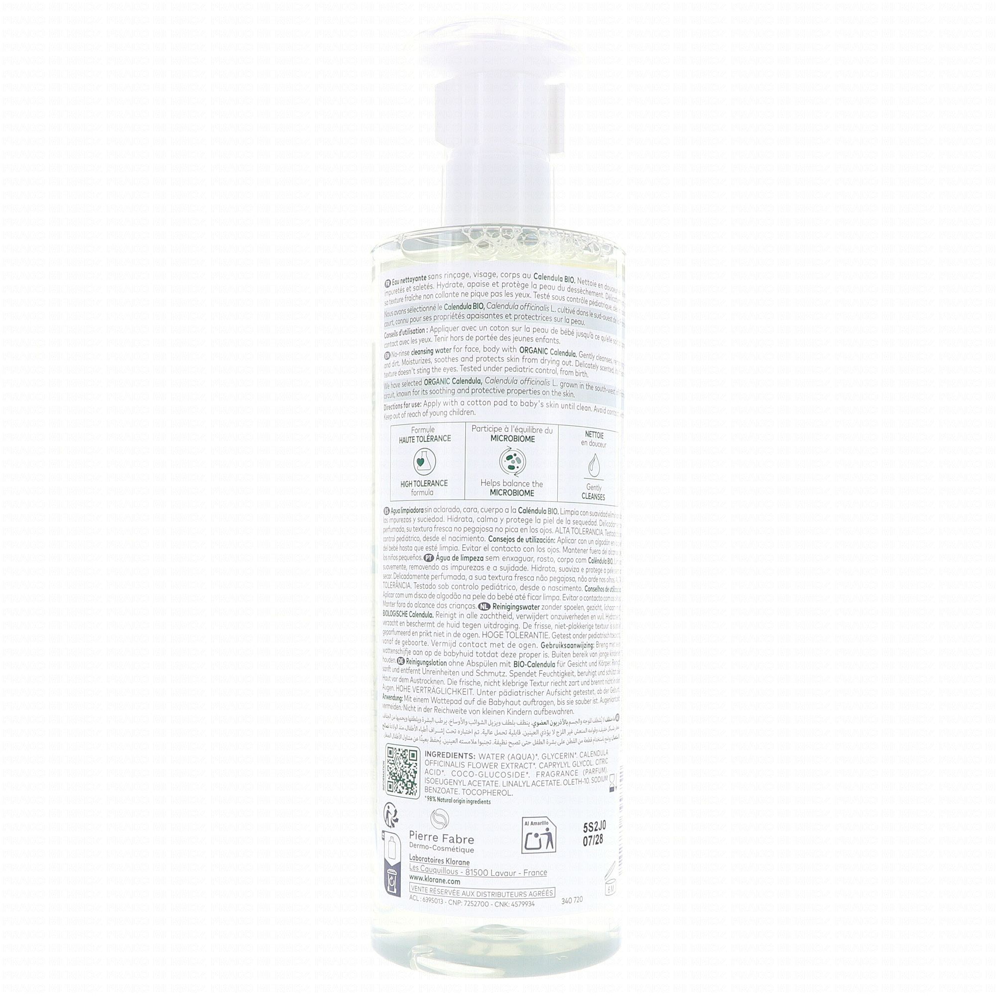 Idéale pour nettoyer et apaiser la peau du bébé, l'eau micellaire de Klorane est composée de Calendula, aux propriétés apaisantes et réparatrices, d'actifs hydratants qui rendent sa peau douce et apaisée. Apaisante, adoucissante, hydratante, protectrice et réparatrice. Sans paraben, sans alcool. Hypoallergénique. Conditionnement : flacon pompe.
