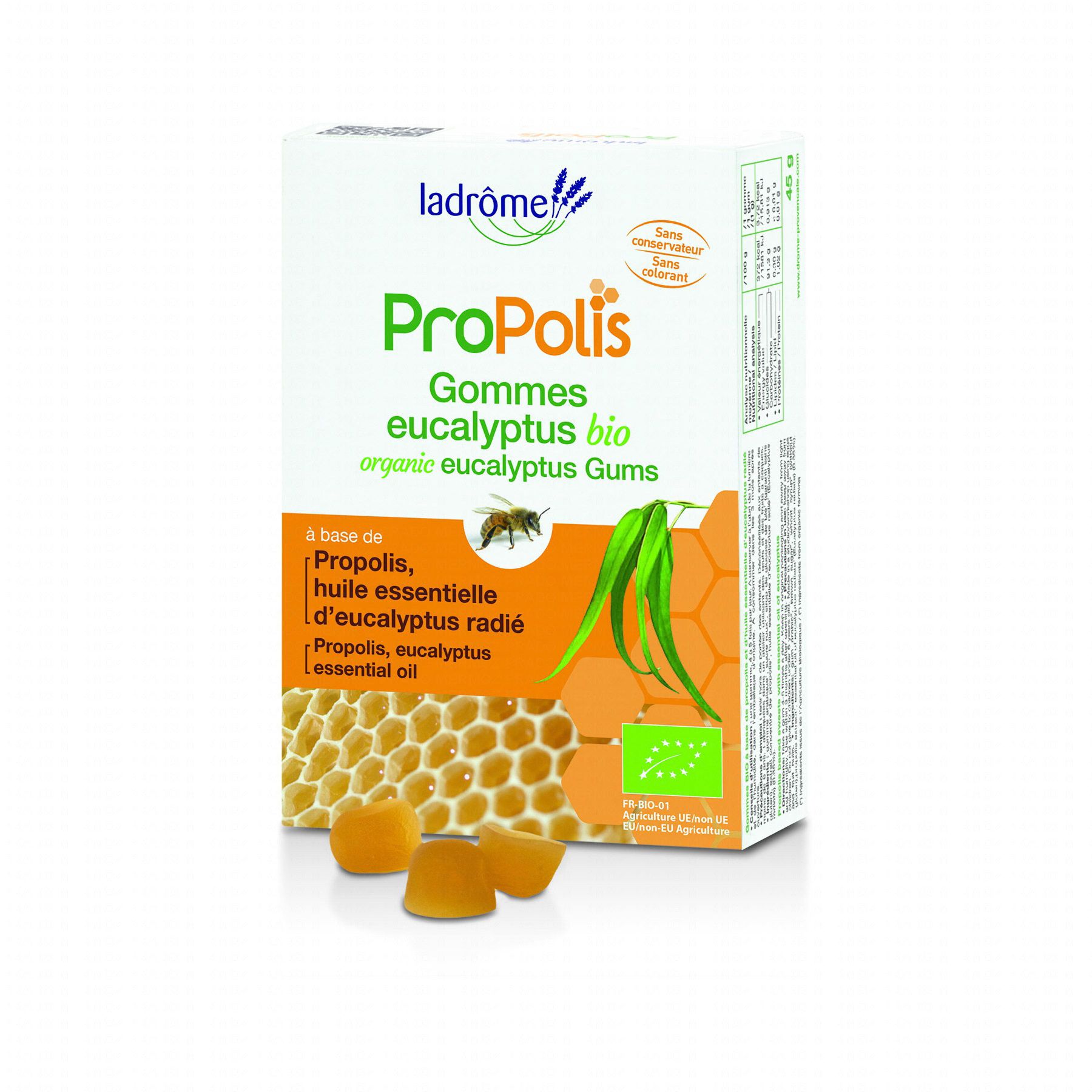 LADRÔME Propolis gommes eucalyptus bio 45g contient les éléments suivants :