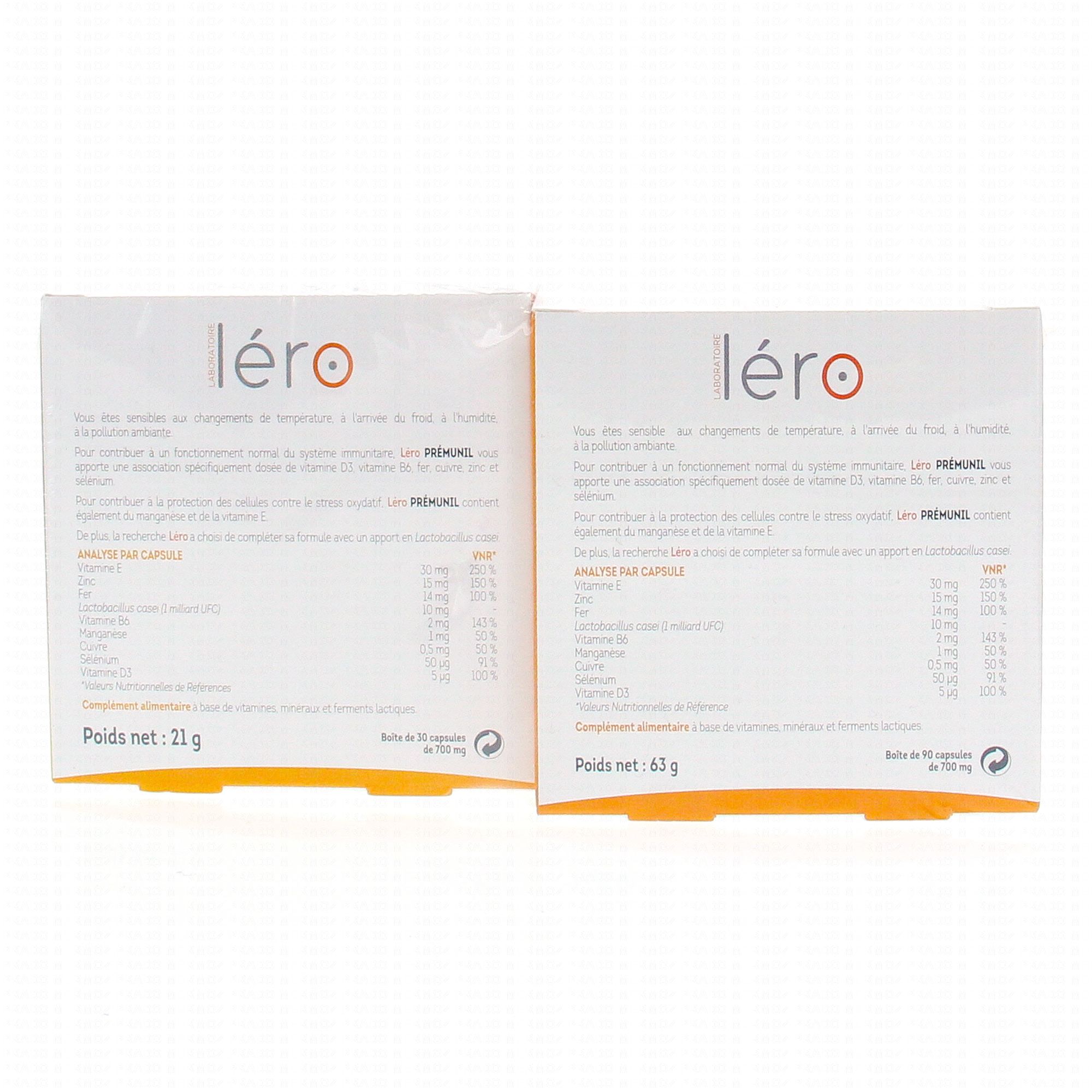 Formulé à base d'une combinaison équilibrée de vitamines, oligo-éléments et probiotiques, Léro Prémunil renforce les défenses naturelles de l'organisme Sans OGM. Protège et renforce les défenses de l'organisme. Antiradicalaire. Conditionnement : sous blister, étui carton. immunité. Périodes hivernales, pollution.