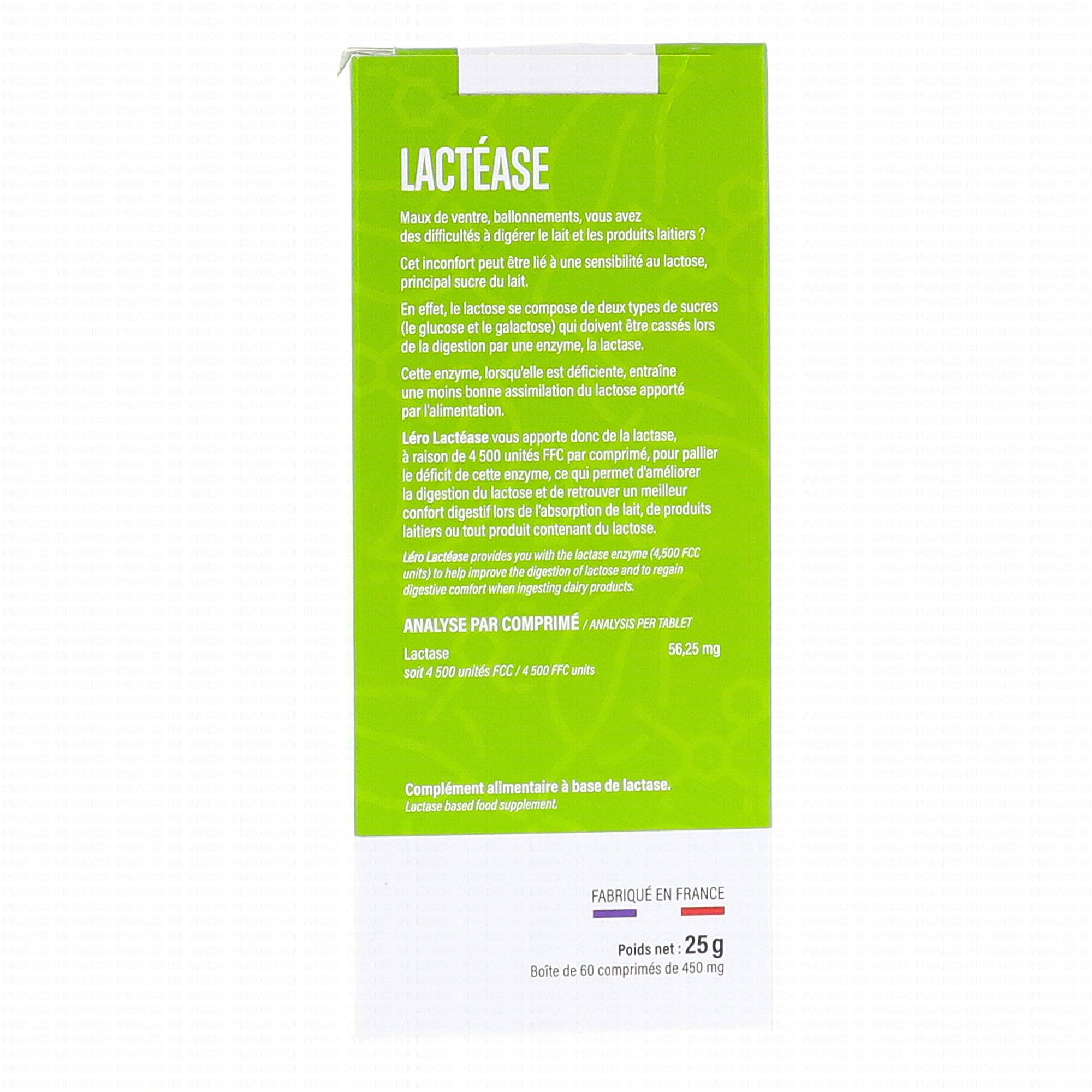 Le Lactéase des laboratoires LERO est un complément alimentaire permettant d'améliorer le confort digestif des personnes étant intolérantes au lactose ou simplement en cas de ballonnements suite à la prise de produits contenant ce glucide (lait, produits laitiers). Lactéase se charge donc de diffuser 4500 unité de lactase dans le corps, ce qui facilite la digestion.