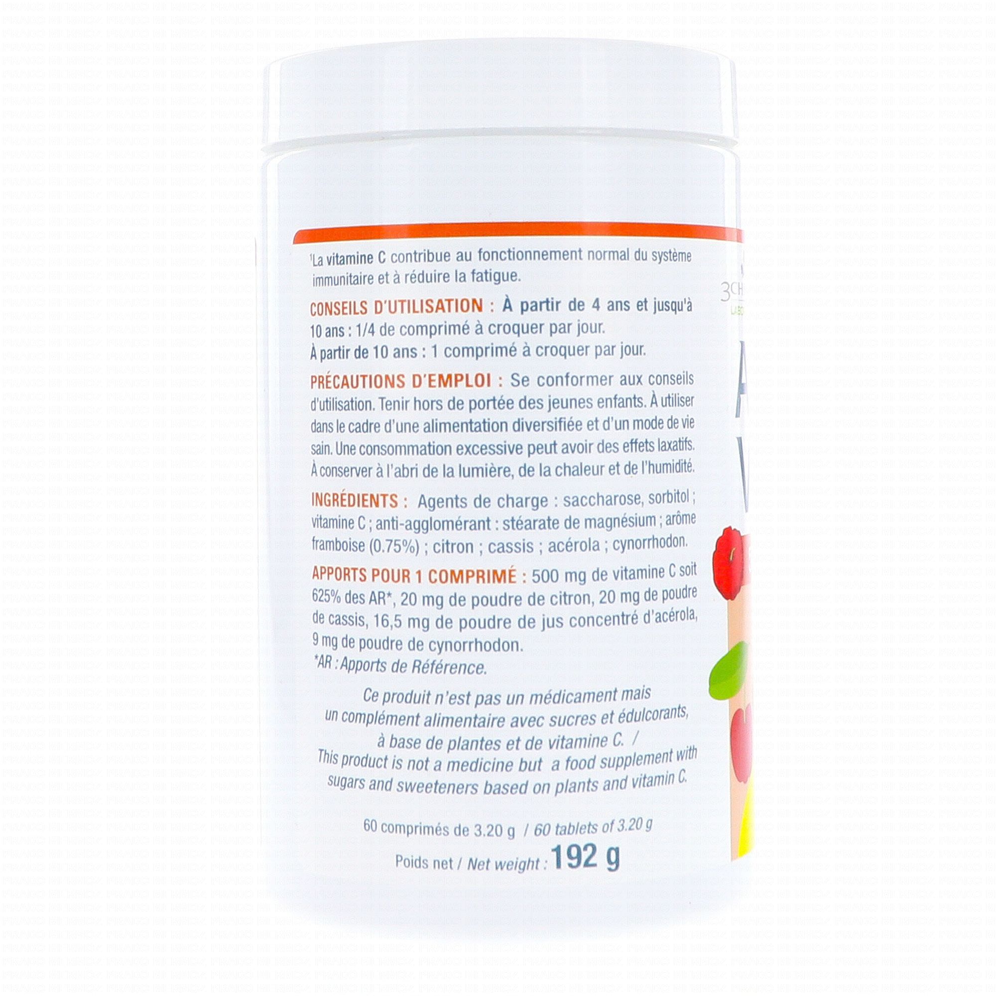 500 mg de vitamine C par comprimé. Agents de charge : saccharose et sorbitol ; vitamine C ; anti-agglomérant : stéarate de magnésium ; arôme framboise (0.75%) ; citron ; cassis ; acérola (non origine France) ; cynorrhodon