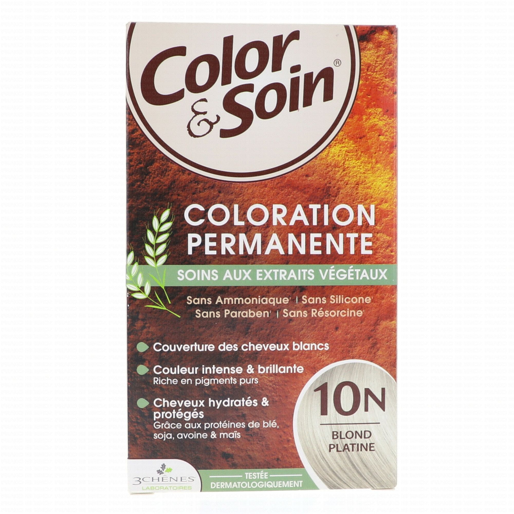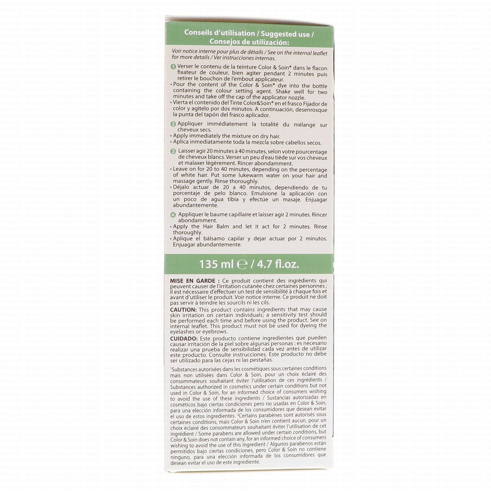Sans ammoniaque, paraben, ni résorcine, la coloration Color & Soin couvre intégralement les cheveux blancs, sans s'estomper au lavage. Sa teneur en protéines végétales et huiles essentielles constitue un réel soin capillaire, qui préserve l'équilibre du cuir chevelu et la fibre capillaire. Couleur longue durée. Couvre les cheveux blancs, respecte la fibre capillaire. Sans ammoniaque, sans résorcine, sans silicone. Conditionnement : 1 teinture, 1 fixateur, 1 baume capillaire stabilisateur, 1 paire de gants.