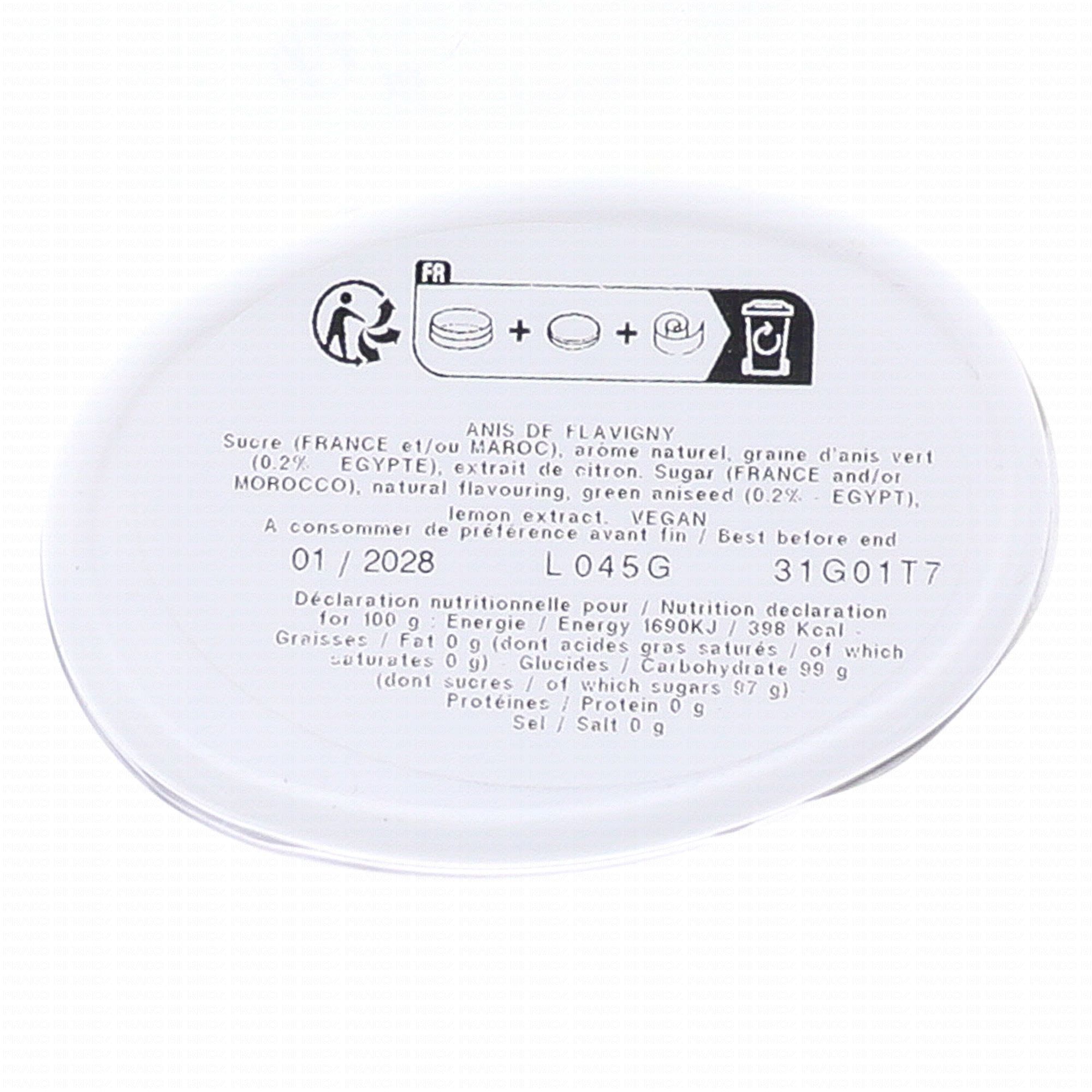 Sucre, Arôme naturel, Graine d'anis vert (0,2%), Extrait de citron.
