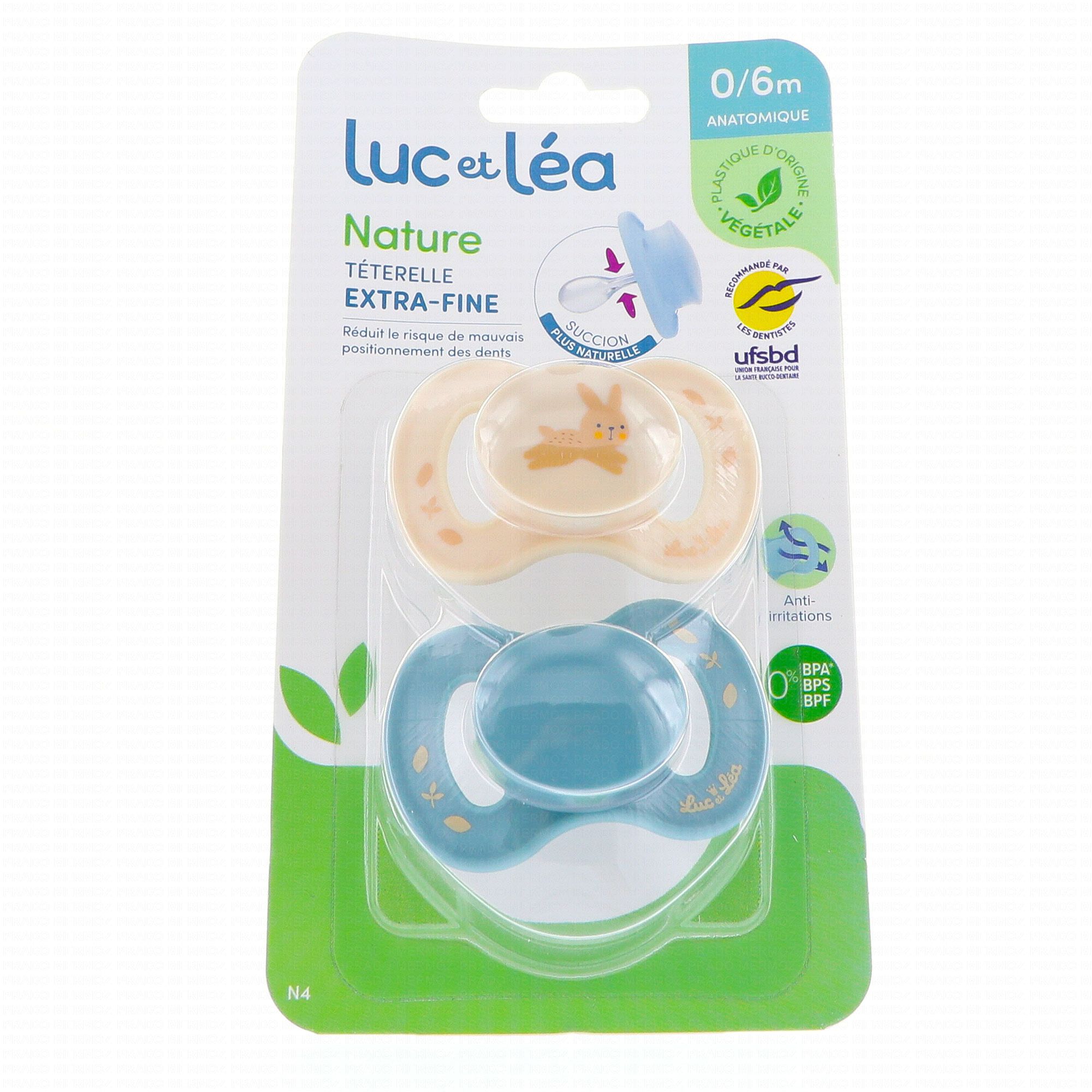 Luc et Léa Nature 2 Sucettes Anatomiques Téterelle Extra-Fine 0-6 Mois - Modèle : Beige Lapin et Bleu sont des sucettes conçues pour réduire le risque de mauvais positionnement des dents.