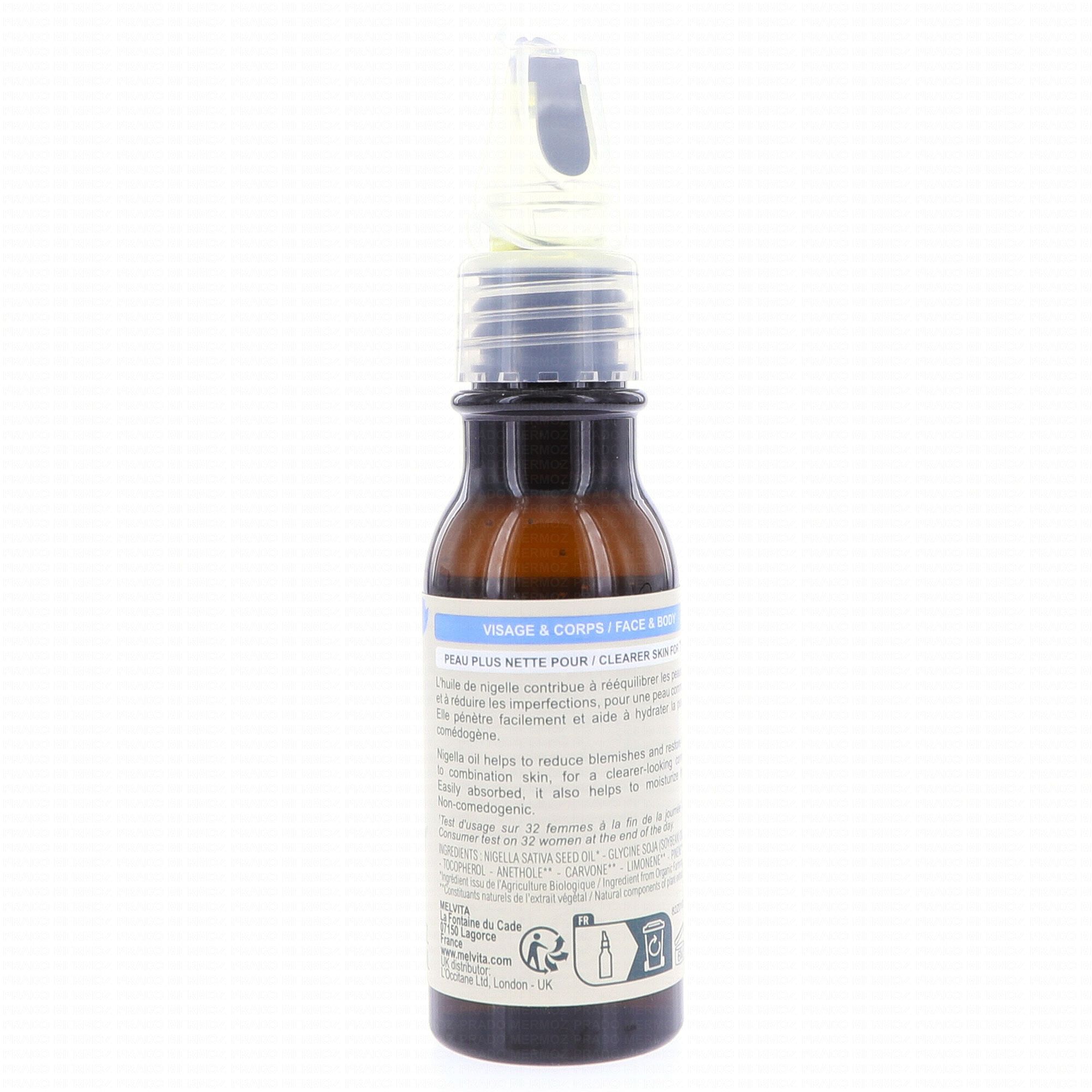 Adaptée aux besoins des peaux mixtes à grasses, l'huile de nigelle bio est reconnue pour ses propriétés purifiantes. Certifiée biologique et 100% naturelle, l'huile de nigelle bio est obtenue par première pression à froid des graines de nigelle, plante aromatique recommandée pour son action purifiante. Elle stimule les mécanismes d'auto-défense de la peau, limite les inflammations superficielles et agit comme un antiseptique naturel : jour après jour, la peau est vivifiée, rééquilibrée et purifiée.
