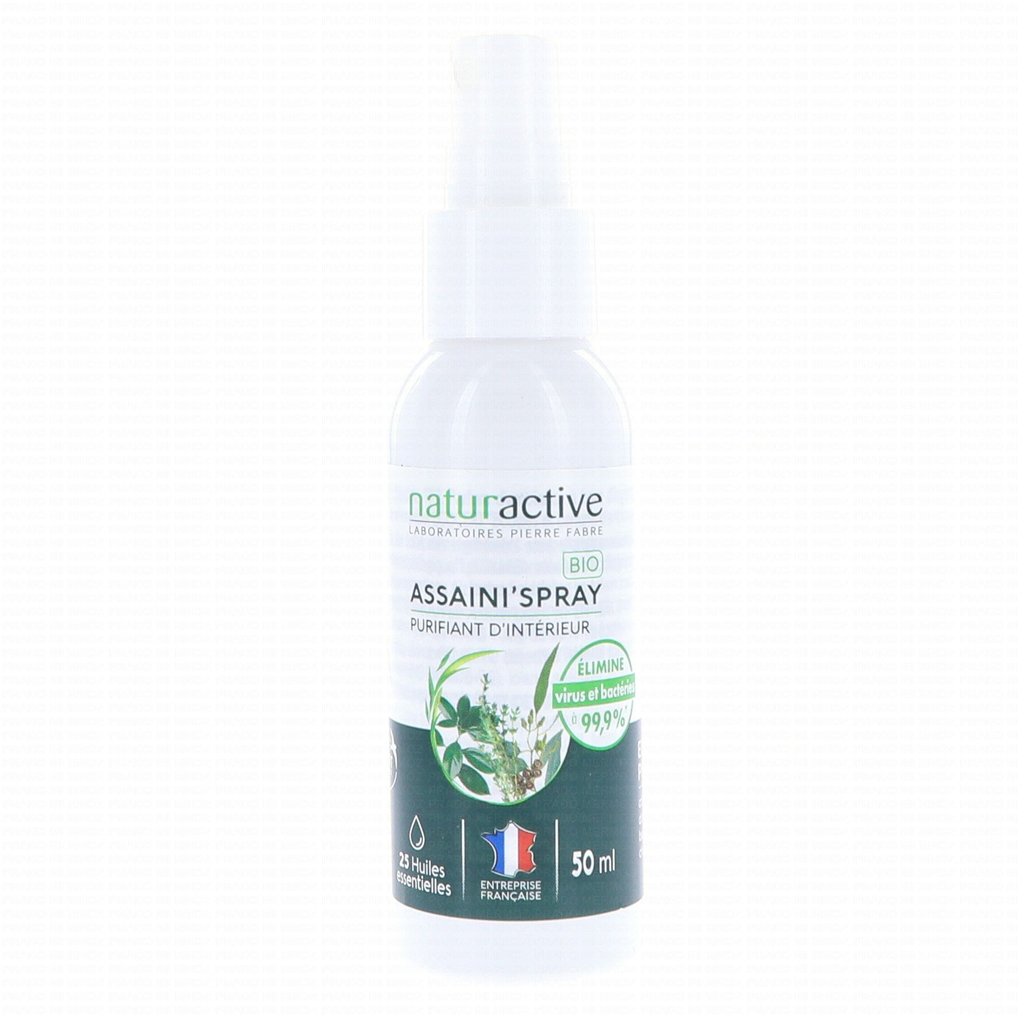 Parfait assainissant d'intérieur, le spray Bio Naturactive Assaini'Spray est un résultat de 25 huiles essentielles biologiques reconnues pour leurs propriétés assainissantes et parfumantes. Ingrédients issus de l'agriculture biologique certifiée Ecocert. Conditionnement : vaporisateur sans gaz propulseur.
