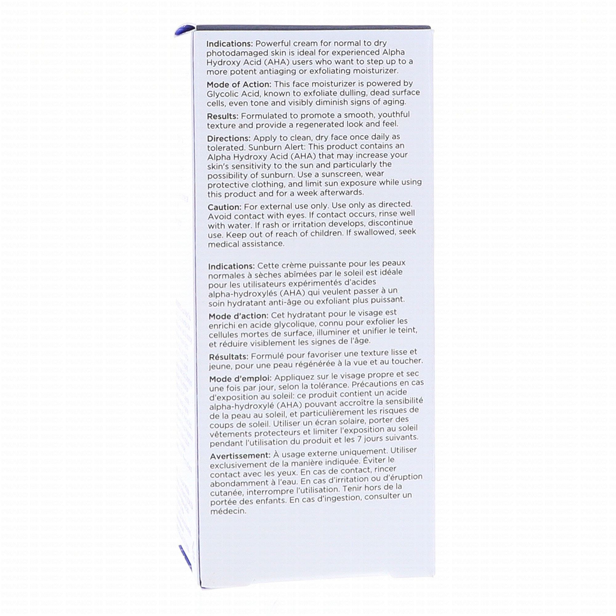 Précautions en cas d'exposition au soleil: ce produit contient un acide alpha-hydroxy (AHA) pouvant accroître la sensibilité de la peau au soleil, et particulièrement les risques de coups de soleil. Utiliser un écran solaire, porter des vêtements protecteurs et limiter l'exposition au soleil pendant l'utilisation du produit et les 7 jours suivants. Utiliser exclusivement de la manière indiquée.