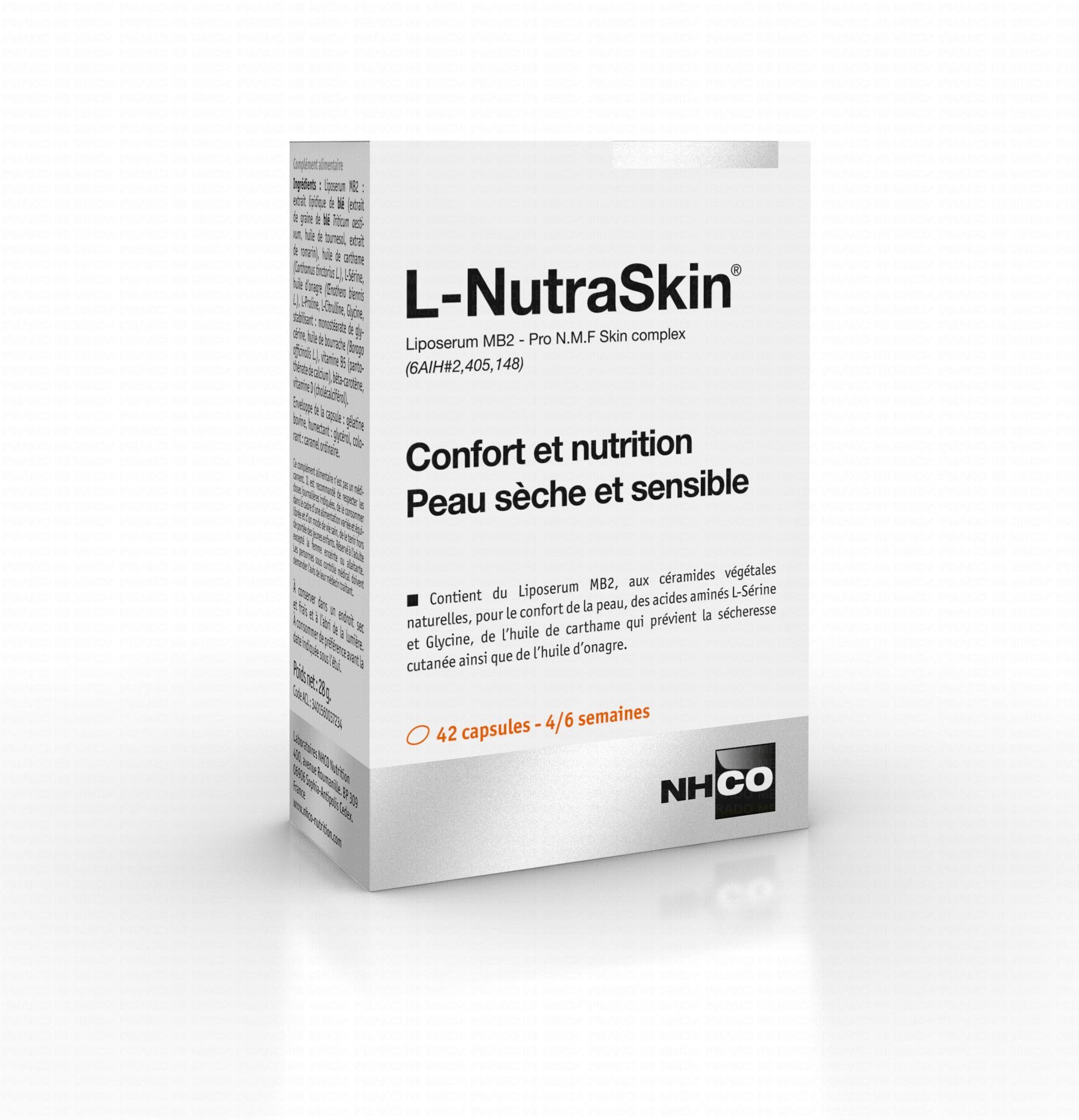 NHCO L-NutraSkin est un complément alimentaire destiné aux personnes qui recherchent confort et nutrition pour leur peau sèche et sensible. Il contient des acides gras et des céramides extraits de la graine de blé ainsi que des huiles végétales de bourrache, carthame et onagre. Il contient également de la provitamine A et des acides aminés naturellement présents dans l'épiderme.