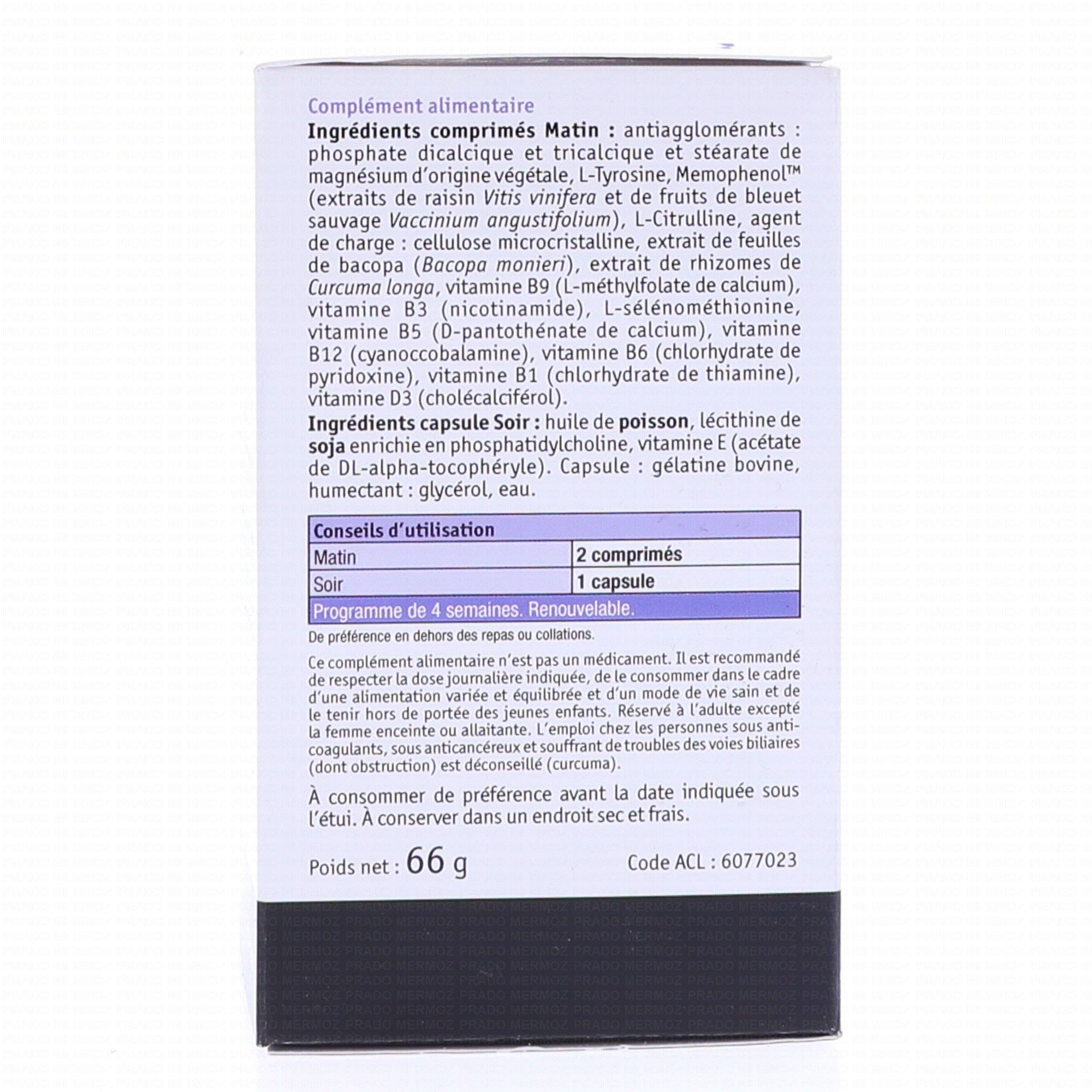 Ingrédients comprimés (matin): agent de charge: cellulose microcristalline, antiagglomérants: phosphate dicalcique et stéarate de magnésium, L-Tyrosine, memophenol (extrait de raisin vitis vinifera et de bleuet sauvage vaccinium angustifolium), L-citrulline, extrait de feuilles de bacopa ( bacopa monieri), extrait de rhizome de curcuma longa, bisglycinate de zinc, L-sélénométhionine, vitamine B3 (nicotinamide), vitamine B5 (D-pantothénate de calcium), vitamine B12 (cyanocobalamine), vitamine B6 (chlorhydrate de pyridoxine, vitamine B1 (chlorhydrate de thiamine), vitamine D3 (cholécalciférol), vitamine B9 ( L-méthylfolate de calcium).