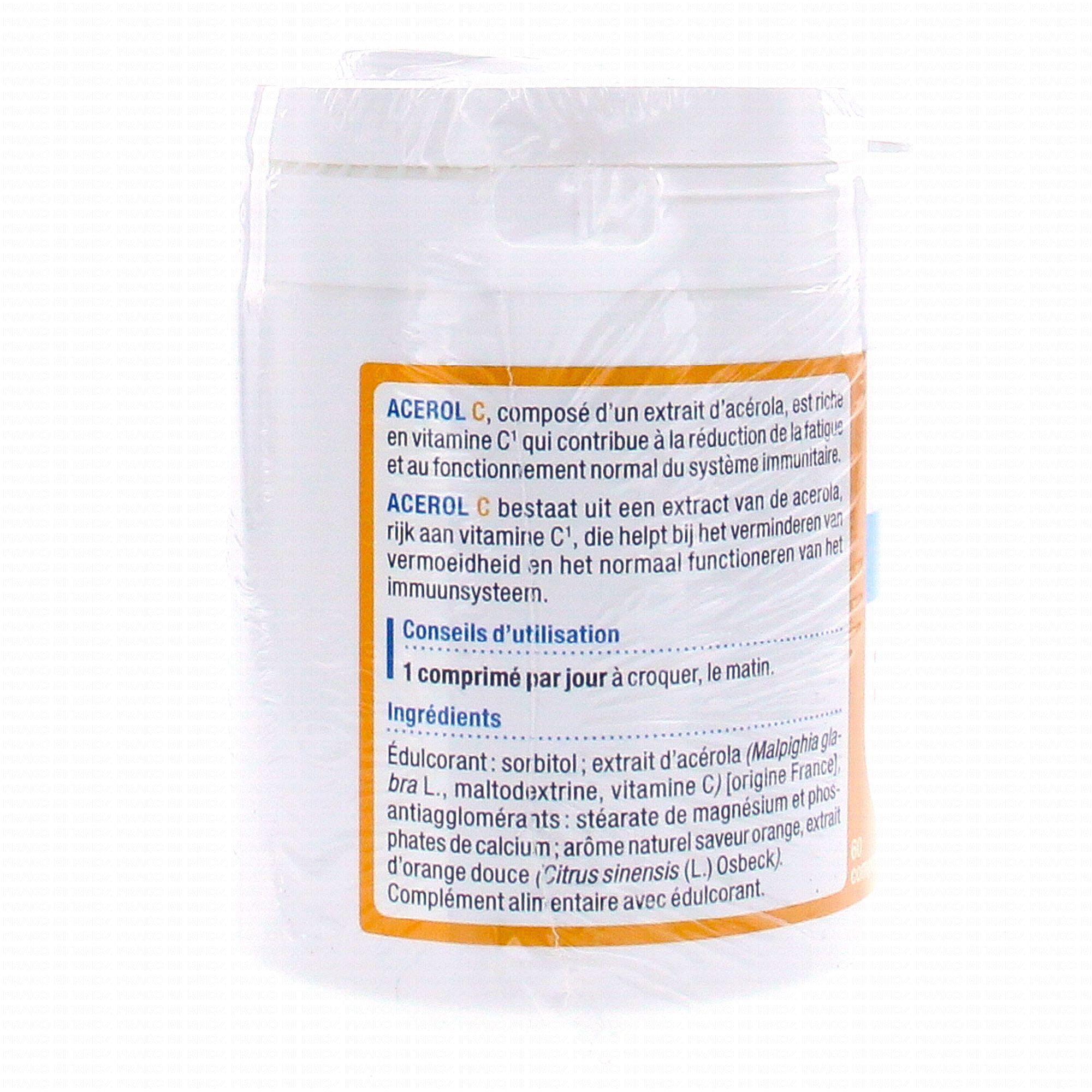 ACEROL C est formulé base d'extrait d'Acérola riche en vitamine C qui réduit la fatigue et favorise le fonctionnement normal des systèmes nerveux et immunitaire. Associe un extrait d'acérola à des citroflavonoïdes qui potentialisent l'assimilation de la vitamine C et son action antioxydante. Avec édulcorant, arôme orange. Conditionnement : tube plastique, pot plastique. Fatigue passagère, résistance de l'organisme vis à vis des affections hivernales.
