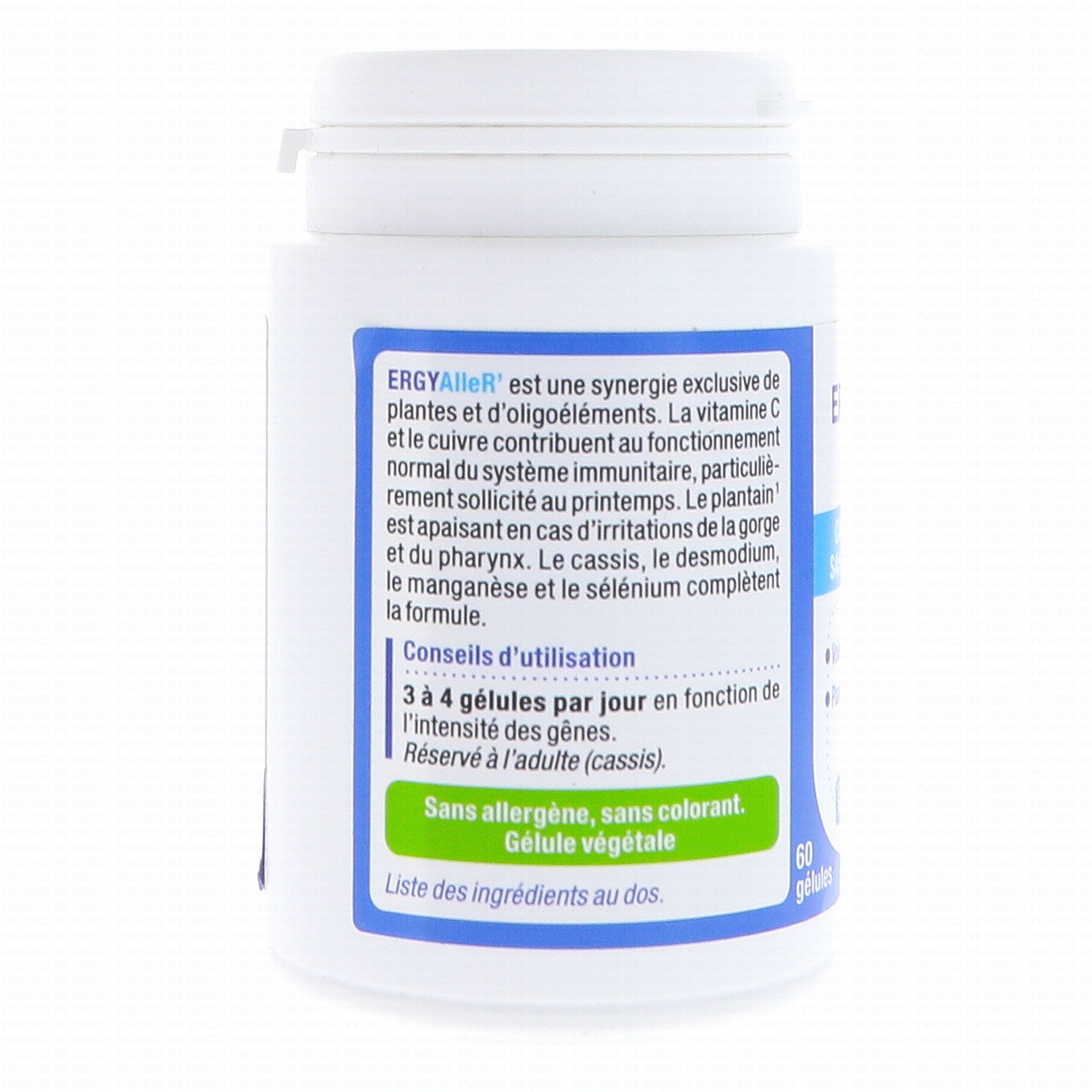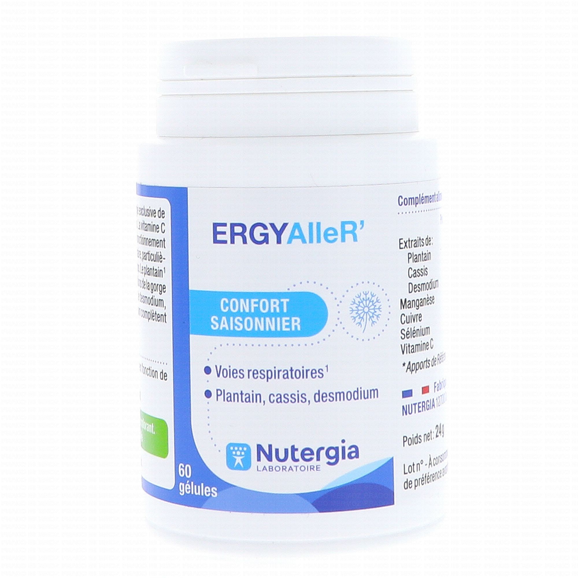 NUTERGIA Ergyaller est un complément alimentaire aux extraits de plantes et minéraux. Le plantain soutient le confort respiratoire et procure un effet apaisant sur le gorge et le pharynx en cas de chatouillement. Il est également naturellement source d'antioxydants. La vitamine C et le cuivre contribuent au fonctionnement normal du système immunitaire et contribuent, avec le manganèse, à protéger les cellules contre le stress oxydatif.