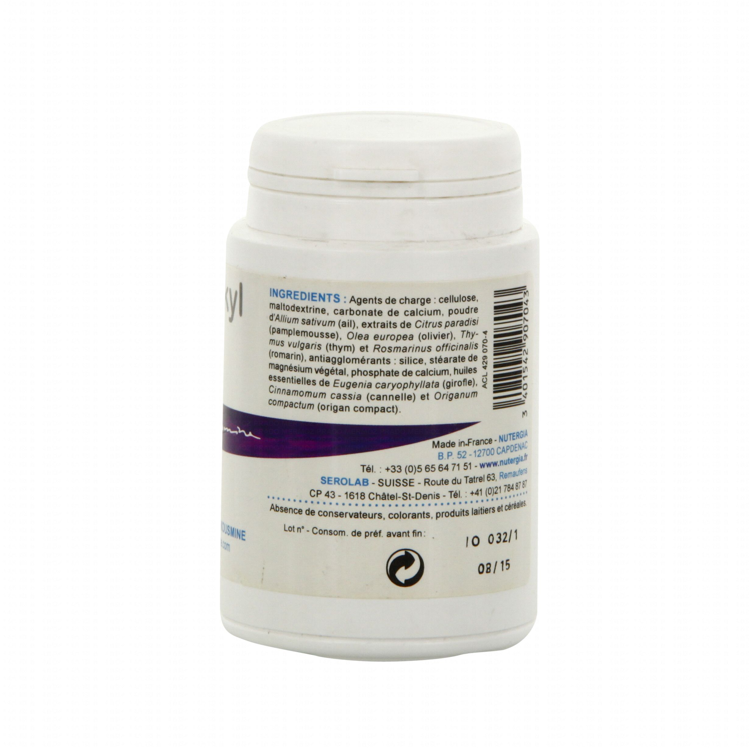 Agents de charge : cellulose et maltodextrine ; carbonate de calcium, poudre d'ail (Allium sativum), extraits de pamplemousse (Citrus paradisi), olivier (Olea europea), thym (Thymus vulgaris) et romarin (Rosmarinus officinalis), antiagglomérants : phosphate de calcium, stéarate de magnésium végétal et silice; huiles essentielles de girofle (Eugenia caryophyllata), cannelle (Cinnamomum cassia) et origan (Origanum compactum).