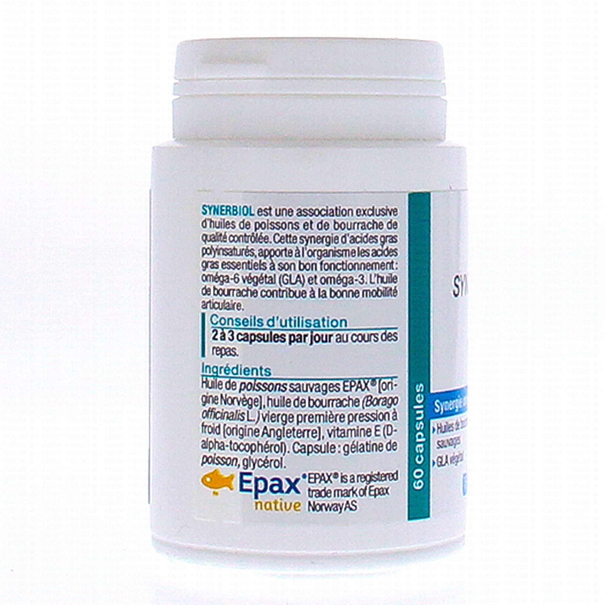 NUTERGIA Synerbiol est un complément alimentaire qui combine des oméga 3 issus d'huile de poissons sauvages, et des oméga 6 issus de l'huile de bourrache. L'huile de bourrache est riche en GLA, acide gras essentiel d'importance pour une peau saine: elle aide à maintenir votre peau fraîche et hydratée.