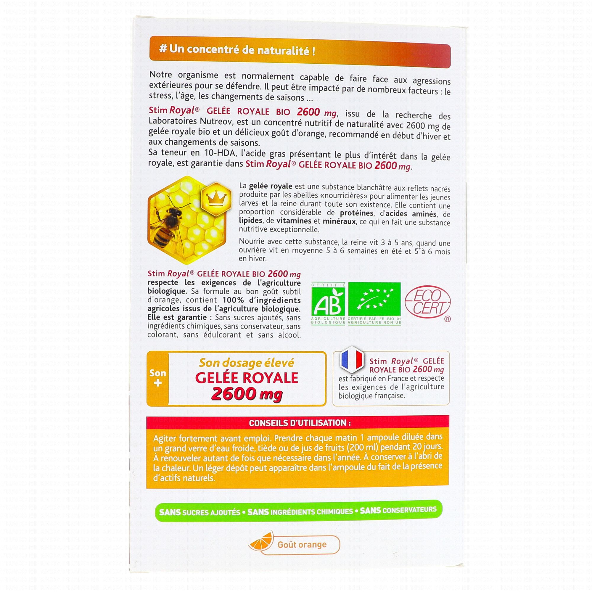 NUTREOV Stim Royal Gelée Royale 2600mg Bio 20 ampoules contient les éléments suivants :