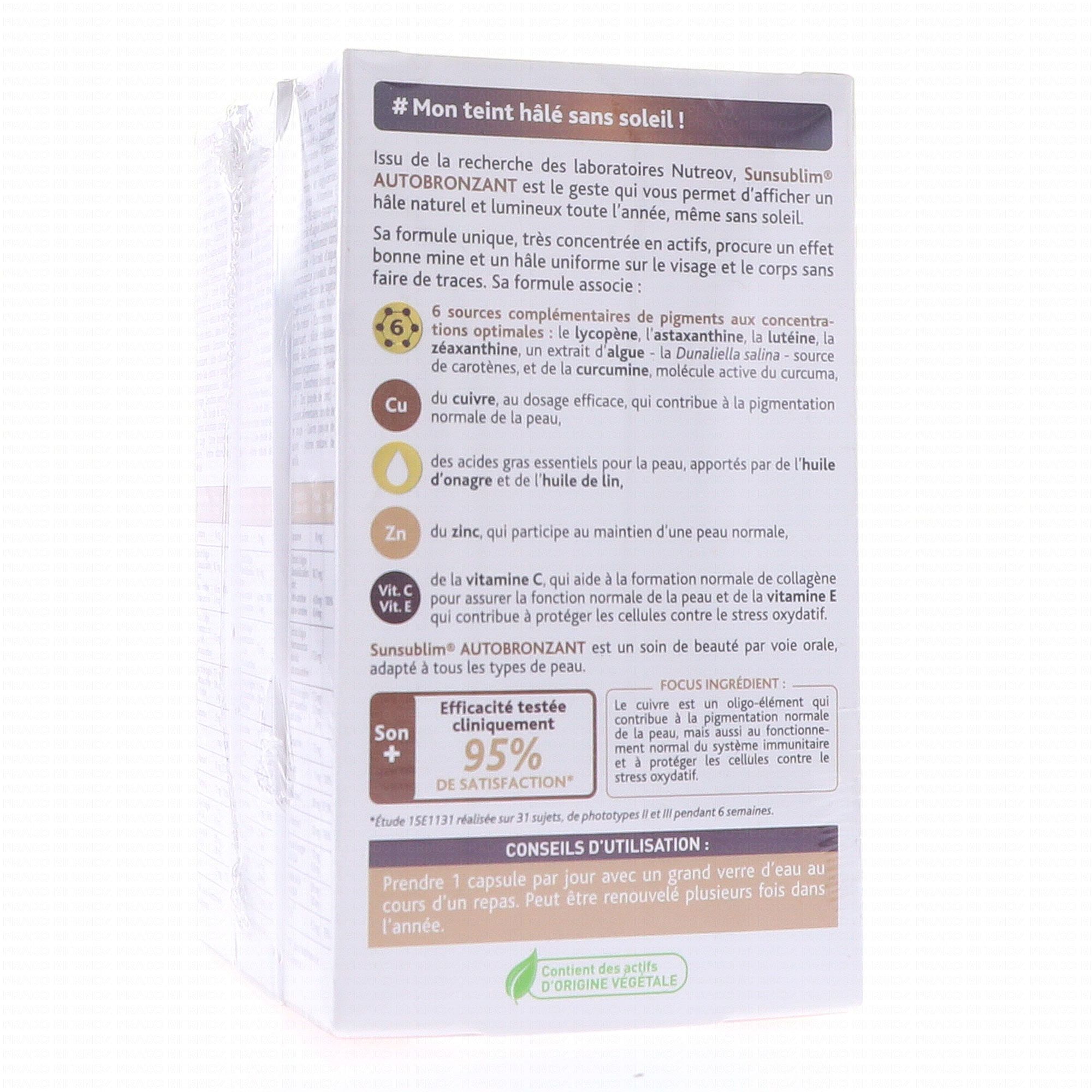 NUTREOV Sunsublim autobronzant lot de 2 x 24 comprimés grace au bêta-carotène peut aider à protéger votre peau des rayons UV excessifs et des coups de soleil.