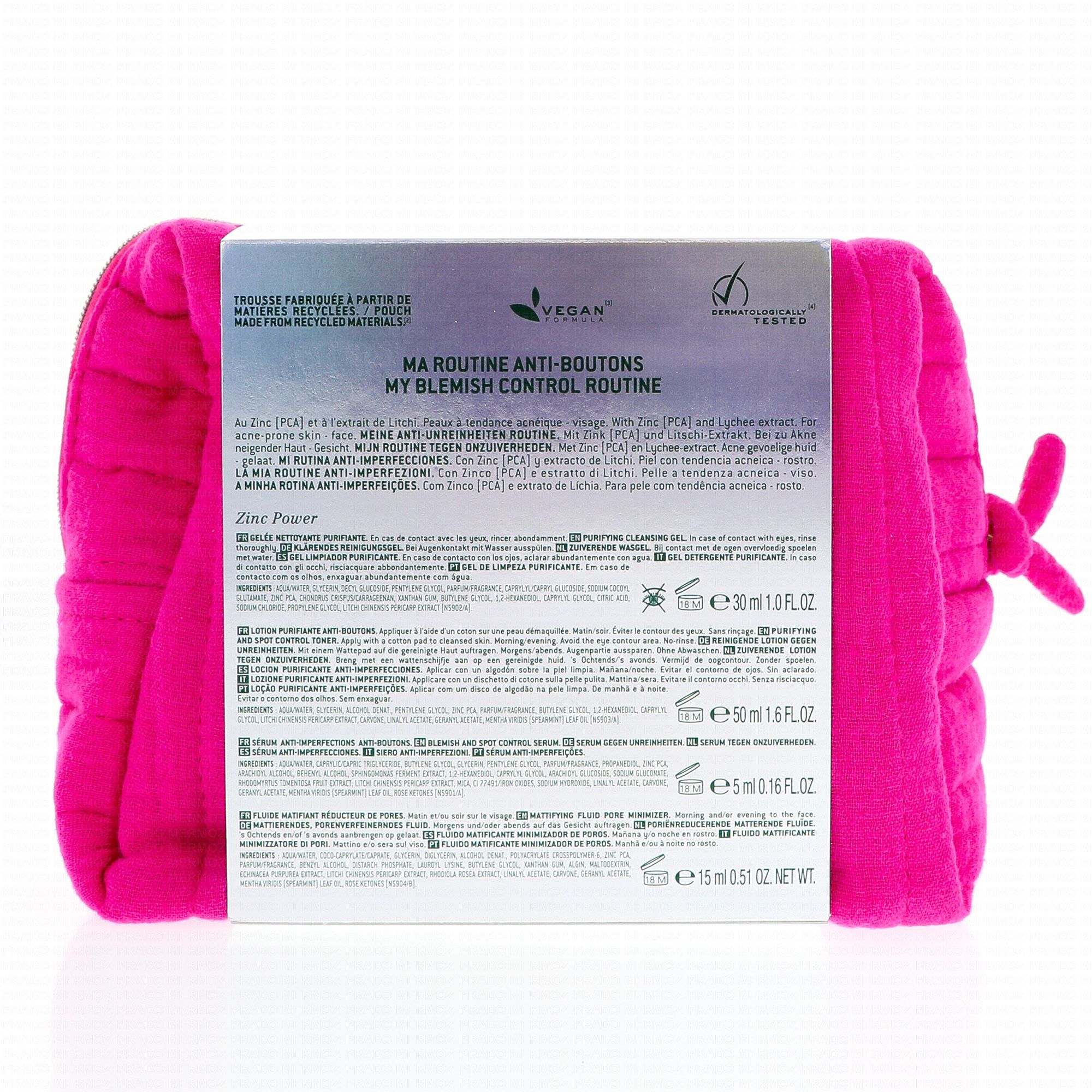 La trousse contient : - 1 gelée nettoyante purifiante Nuxe Zinc Power 30 ml - 1 lotion purifiante anti-boutons Nuxe Zinc Power 50 ml - 1 sérum anti-imperfections anti-boutons Nuxe Zinc Power 5 ml - 1 fluide matifiant réducteur de pores Nuxe Zinc Power 15 ml