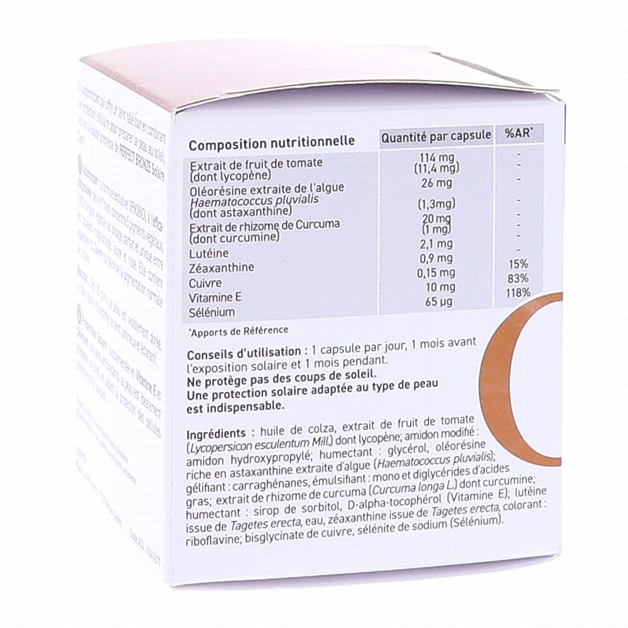 Pour 1 capsule : Extrait de fruit de tomate : 114 mg (dont lycopène : 11,4mg) Oleoresine extraite de l'algue haematococcucs pluvialis : 26mg (dont astaxanthine : 1,3 mg) Extrait de rhizome de curcuma : 20 mg (dont curcumine : 1 mg) Lutéine : 2,1 mg Zéaxanthine : 0,9 mg Cuivre : 0,15 mg (soit 15% des AR*) Vitamine E : 10 mg (soit 83% des AR*) Sélénium : 65 µg (soit 118% des AR*)