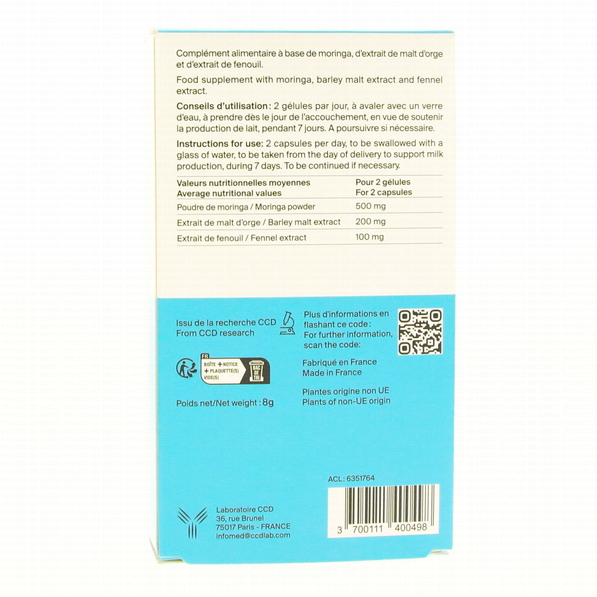 Poudre de moringa 500mg, extrait de malt d'orge 200mg(gluten), gélule d'origine végétale ( hydroxypropylmethylcellulose), agent de charge: gomme d'acacia, extrait de fenouil 100mg