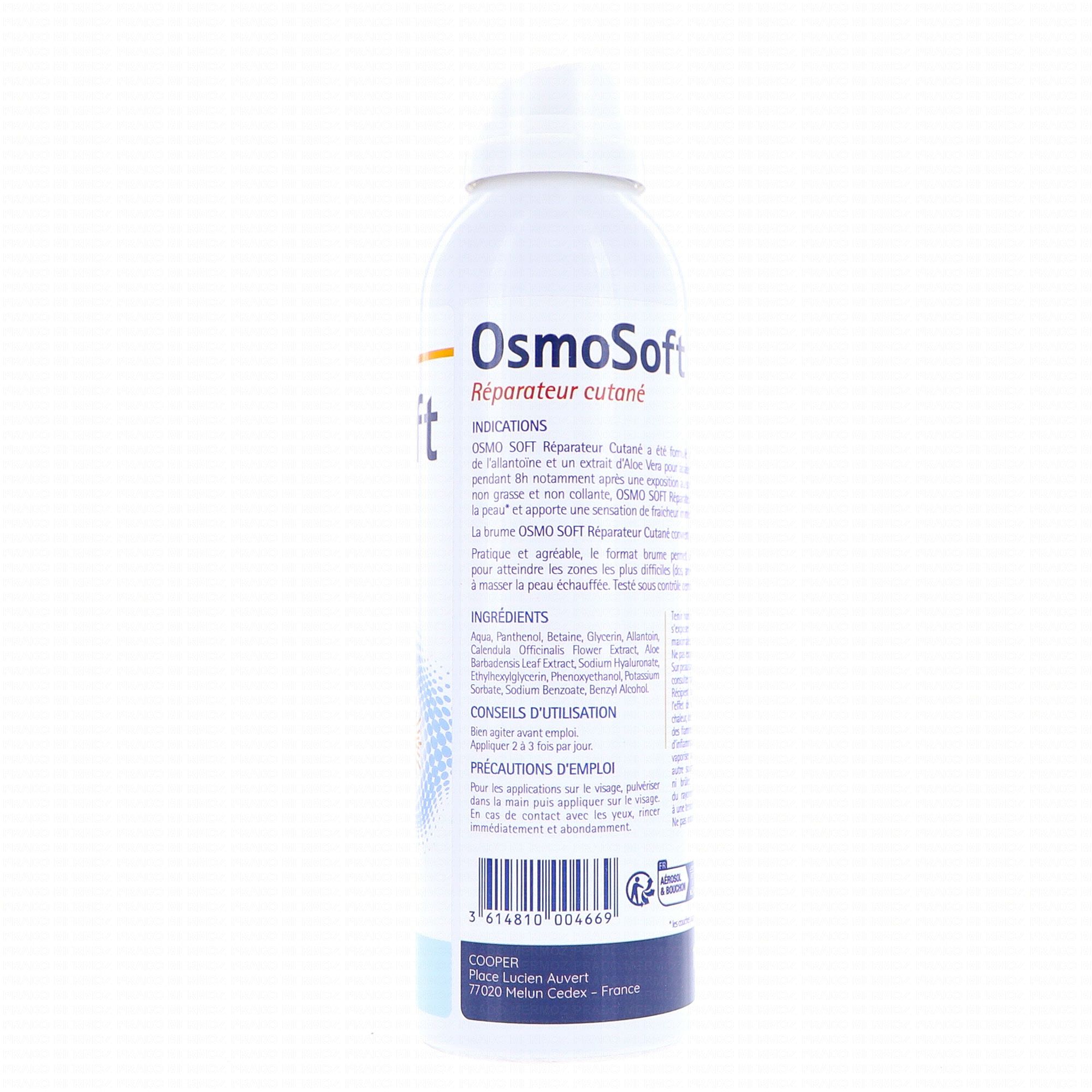 La brume réparatrice Osmosoft apaise, répare et hydrate grâce à son effet froid instantané. Sa formule en acide hyaluronique, en allantoïne et en extrait d'Aloe Vera nourrit la peau 8h après l'exposition au soleil. Elle procure un sentiment de fraicheur et laisse un fini non gras et non collant sur la peau. Son format aérosol facilite l'application sur toutes les zones du corps
