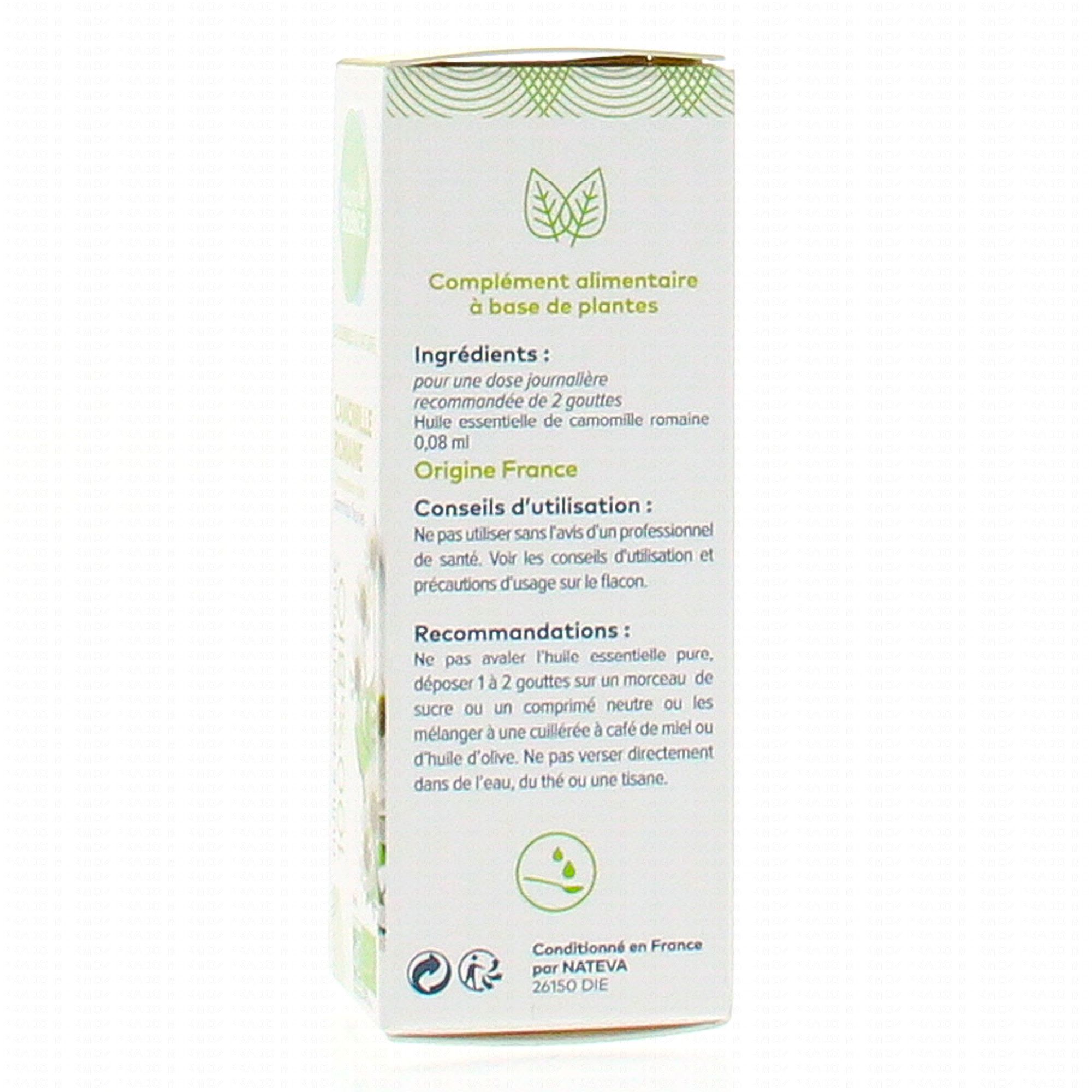 Pour une dose journalière recommandée ( 2 gouttes): huile essentielle de camomille romaine* : 0.08 ml.