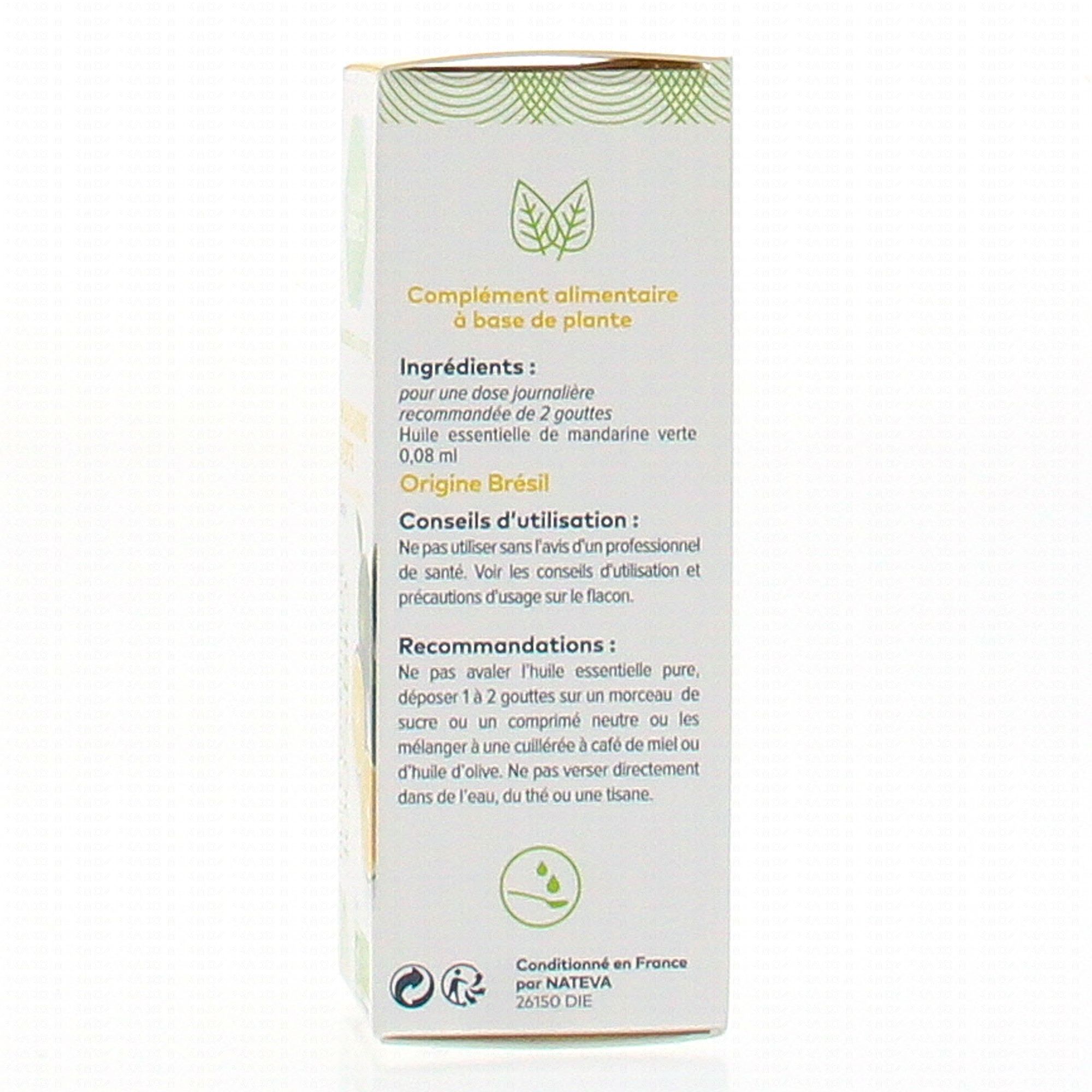 Pour une dose journalière ( 2 gouttes): Huile essentielle de mandarine verte 0.08 ml*.