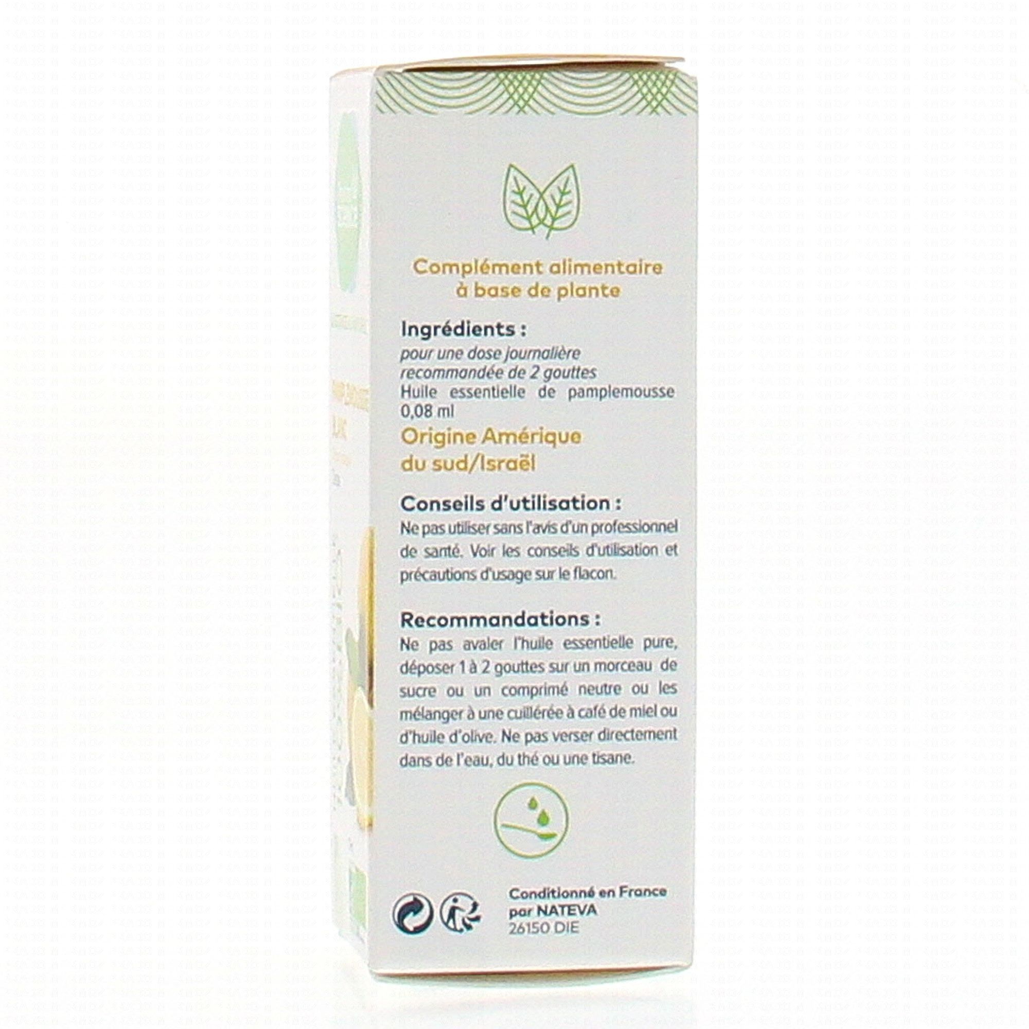 Pour une dose journalière recommandée de 2 gouttes: Huile essentielle de pamplemousse bio 0.08ml.