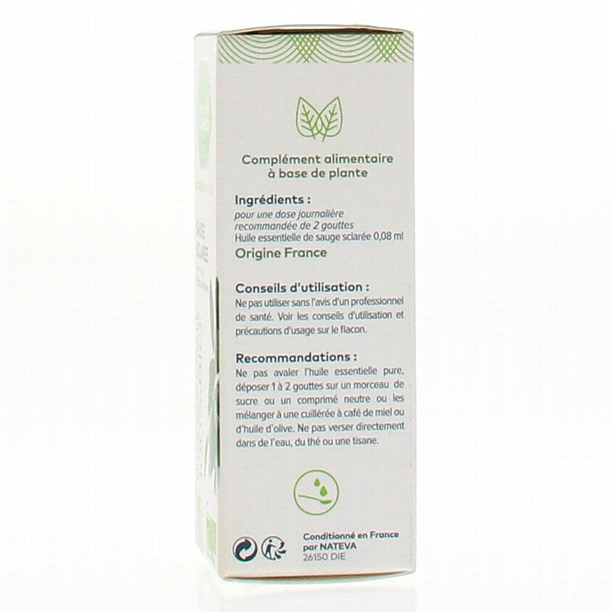 Pour une dose journalière recommandée 2 gouttes: Huile essentielle de sauge sclarée 0.08 ml*.
