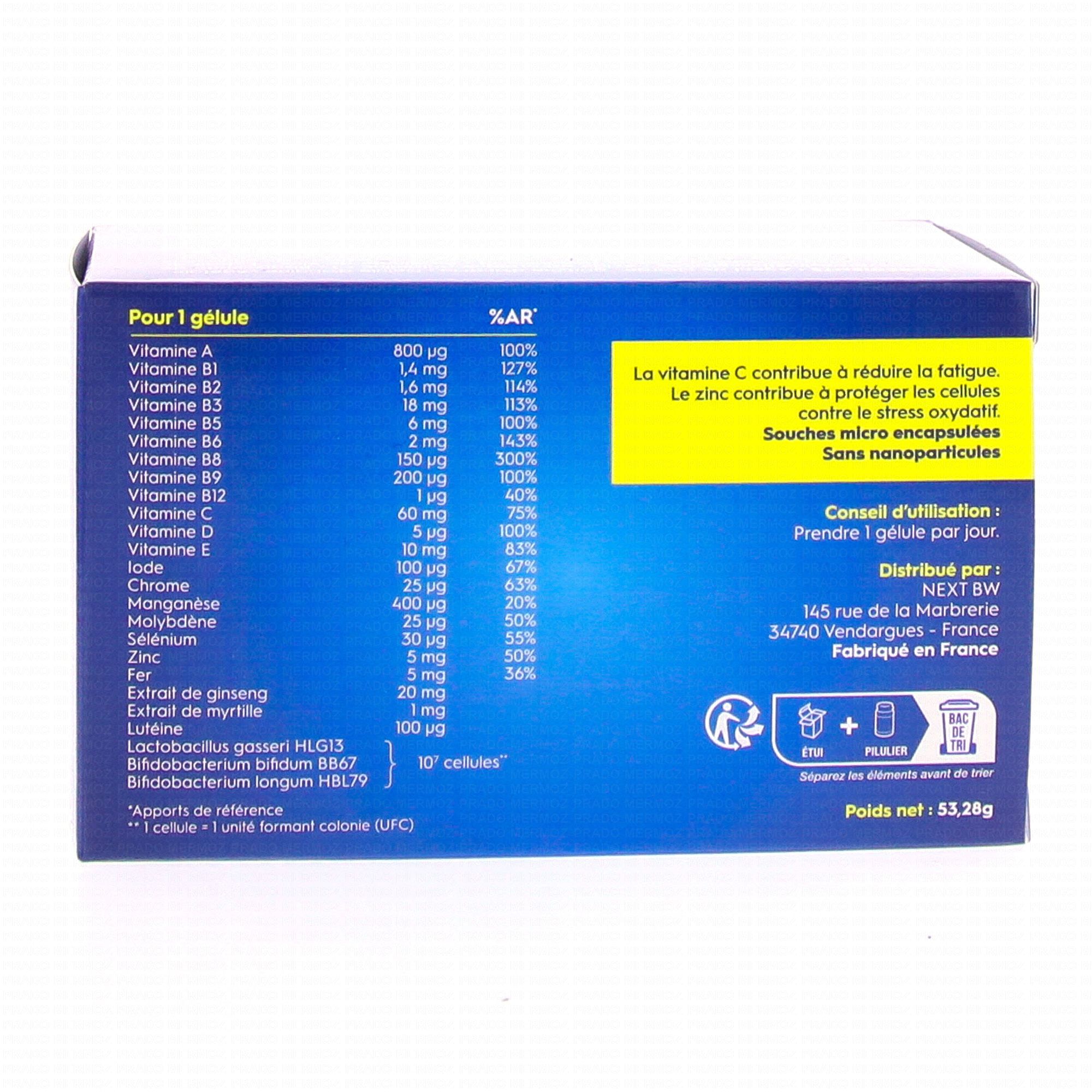 Agent de charge: gomme d'acacia; Gélule d'origine végétale hydroxypropylmethylcellulose: Acide ascorbique (Vitamine C); Bisglycinate de fer; DL-alpha-tocopheryl acetate (Vitamine E); Picolinate de zinc; Extrait de racines de ginseng; Anti-agglomérant: stearate de magnésium; Nicotinamide (Vitamine B3); Levure de bière enrichie en sélénium; lodure de potassium; Pantothenate de calcium (Vitamine B5); Cholecalciferol (Vitamine D3); Beta-carotene (Vitamine A); Chlorhydrate de pyridoxine (Vitamine B6); Molybdate de sodium; Chlorhydrate de thiamine (Vitamine B1); Riboflavine (Vitamine B2); Cyanocobalamine (Vitamine B12); Bifidobacterium bifidum 8867 ; Extrait de baies de myrtille ; Lutéine; Citrate de manganèse; Lactobacillus gasseri HLG13; Bifidobacterium longum HBL79: Acide folique (Vitamine B9); Picolinate de chrome; Biotine (Vitamine B8).