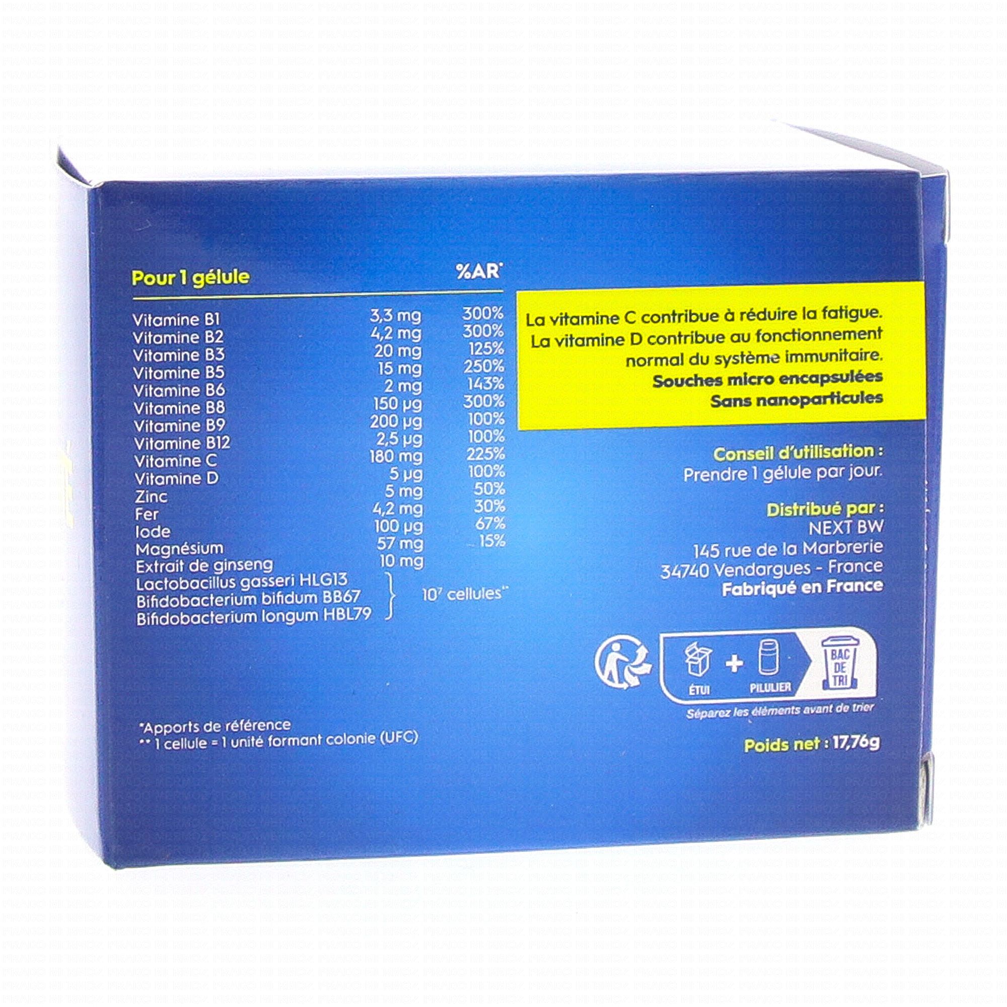 Acide ascorbique (Vitamine C); Gélule d'origine végétale : hydroxypropylméthylcellulose; Oxyde de magnésium marin; Agent de charge: gomme d'acacia; Picolinate de zinc ; Bisglycinate de fer; Anti-agglomérant : stéarate de magnésium; Nicotinamide (Vitamine B3); lodure de potassium ; Cholecalciferol (Vitamine D3); Pantothenate de calcium (Vitamine B5); Extrait de ginseng (Panax ginseng); Cyanocobalamine (Vitamine B12); Chlorhydrate de pyridoxine (Vitamine B6); Chlorhydrate de thiamine (Vitamine B1); Riboflavine (Vitamine B2); Bifidobacterium bifidum BB67; Lactobacillus gasseri HLG13; Bifidobacterium longum HBL79; Acide folique (Vitamine B9); Biotine (Vitamine B8).