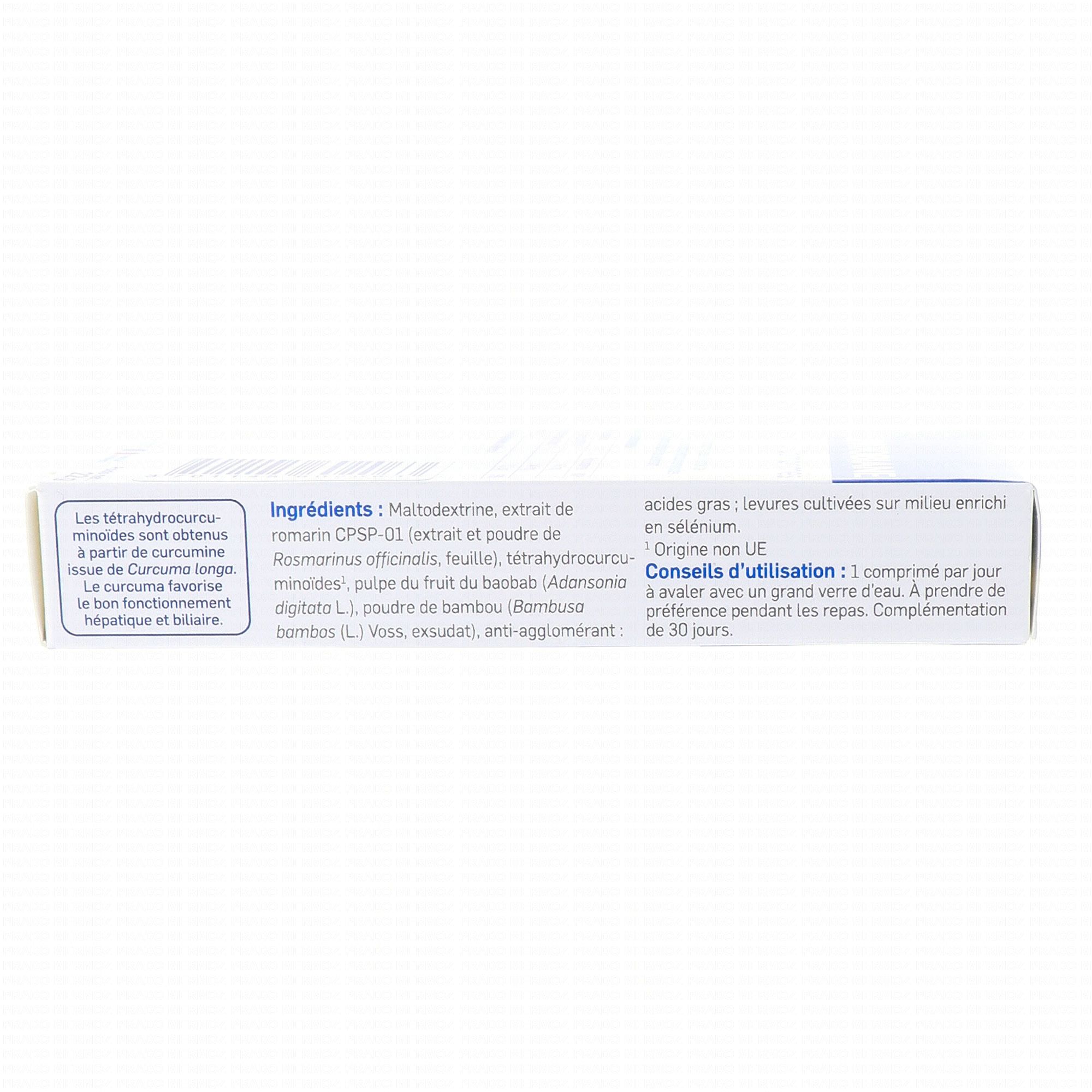 Ingrédients : Extrait de curcuma Curcuma longa (racines) (agent d'enrobage : méthylcellulose), agents de charge : cellulose microcristalline, phosphate tricalcique et croscarmellose sodique, extrait de romarin Rosmarinus officinalis (feuilles) (support : maltodextrines de pomme de terre), anti-agglomérants : mono-di-tri glycéride béhénate et stéarate de magnésium, agent d'enrobage : hypromellose, triglycéride caprylique et polydextrose, extrait de poivre noir Piper nigrum (fruit). Analyse nutritionnelle :