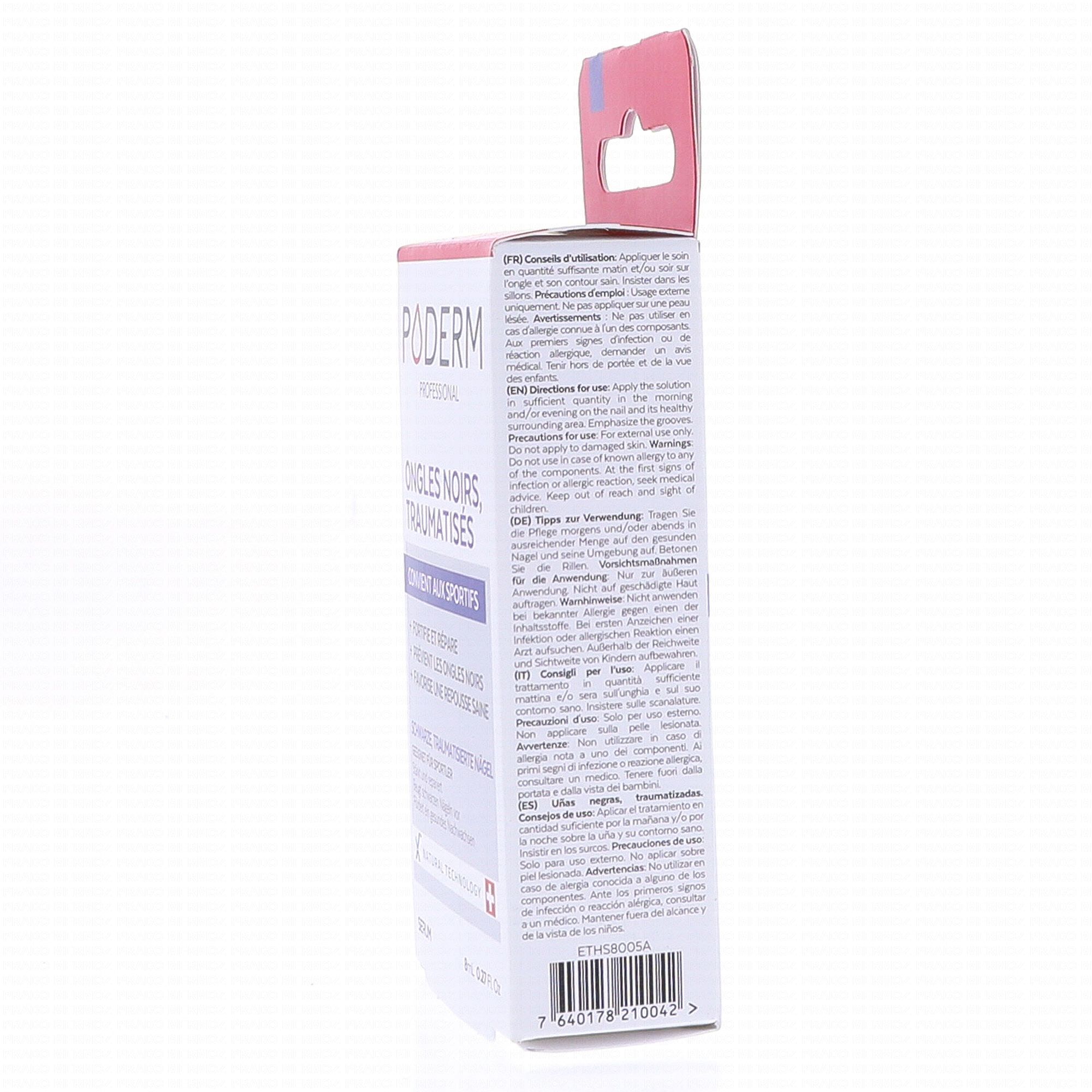 Le sérum FORTIFIANT – ONGLES NOIRS ET TRAUMATISÉS PODERM® répare et protège les ongles noirs, traumatisés par les micro-chocs répétés dans les chaussures fermées, chaussures de football, rugby, trail, ski, course à pied… Ce produit nourrit et améliore l'apparence des ongles des sportifs (ongles noirs/ongles bleus) et prévient les ongles abimés.