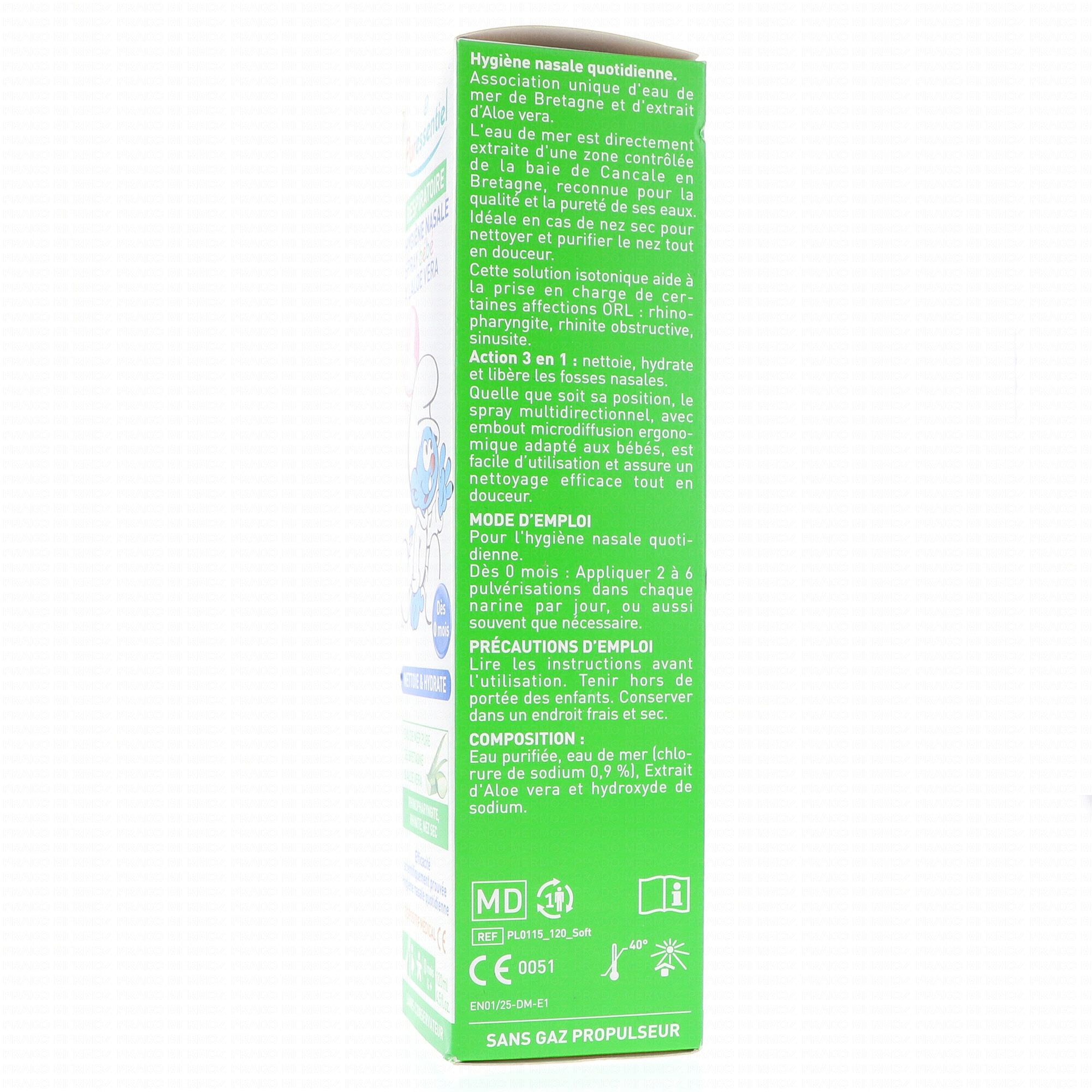 Association unique d'eau de mer de Bretagne et d'extrait d'Aloe vera. L'eau de mer est directement extraite d'une zone contrôlée de la baie de Cancale en Bretagne, reconnue pour la qualité et la pureté de ses eaux. Idéale en cas de nez sec pour nettoyer et purifier le nez tout en douceur. Cette solution isotonique aide à la prise en charge de certaines affections ORL : rhinopharyngite, rhinite obstructive, sinusite. Action 3 en 1 : nettoie, hydrate et libère les fosses nasales. Quelle que soit sa position, le spray multidirectionnel, avec embout microdiffusion ergono+ mique adapté aux bébés, est facile d'utilisation et assure un nettoyage efficace tout en douceur.