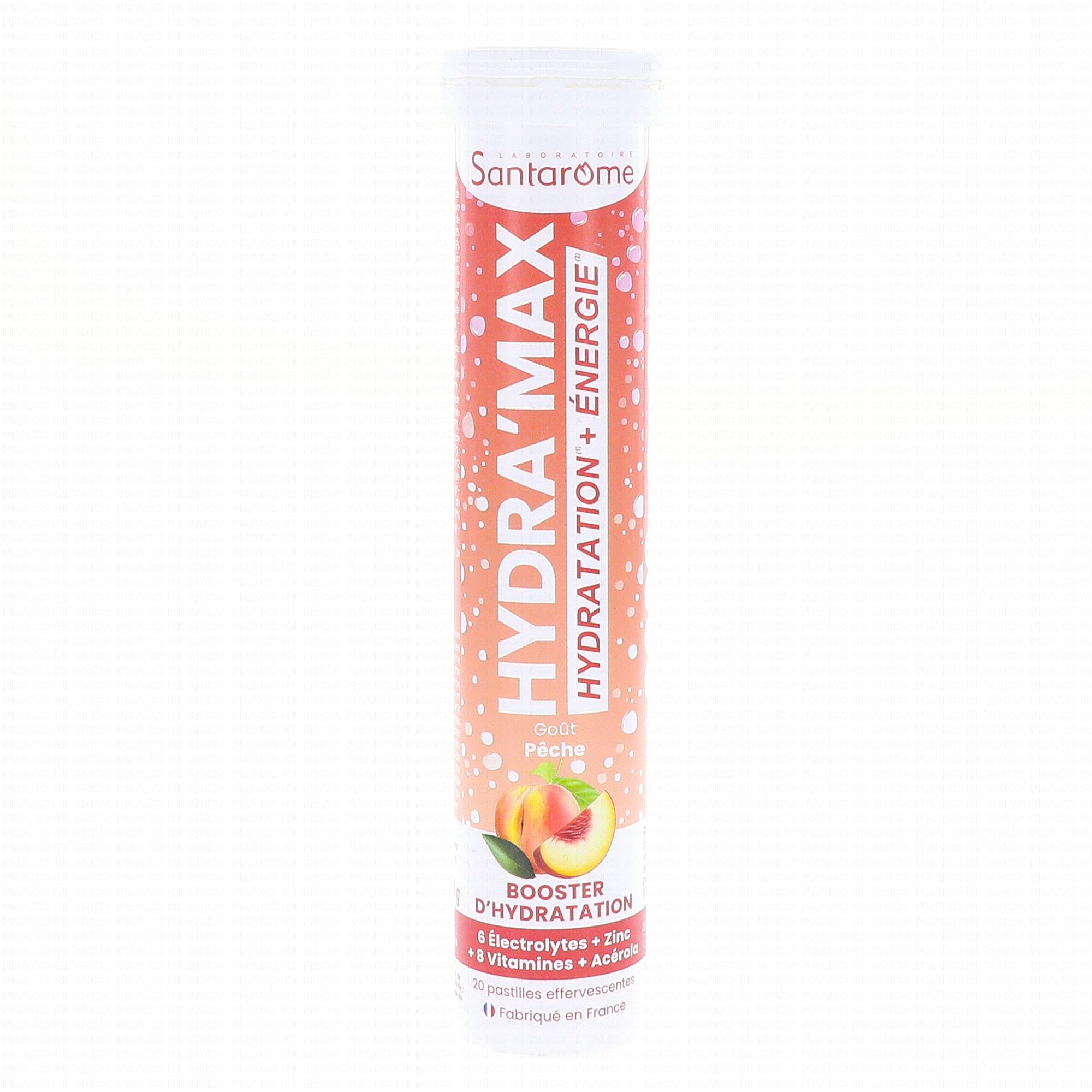 SANTAROME Hydra'Max - Booster d'Hydratation gout Pêche x20 est un complément alimentaire à base d'acérola et de nutriments, avec sucre et édulcorant, qui accroissent l'absorption d'eau par l'organisme grâce à la présence de glucides et d'électrolytes.