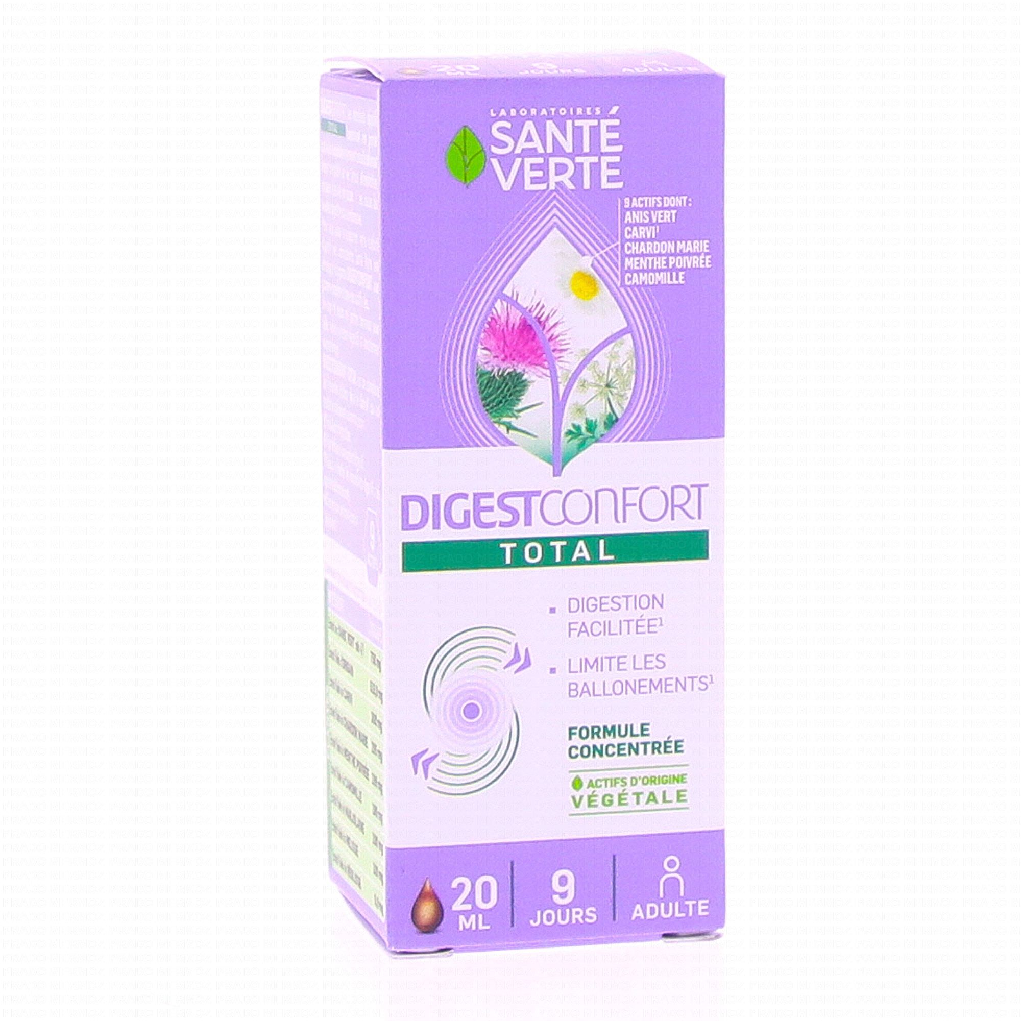 SANTE VERTE Digest Confort Total 20ml est un complément alimentaire qui contribue à soutenir le système digestif grâce à la présence d'Anis, d'Origan et de Carvi. La Menthe poivrée et la Mélisse favorisent le bon fonctionnement du tractus intestinal.