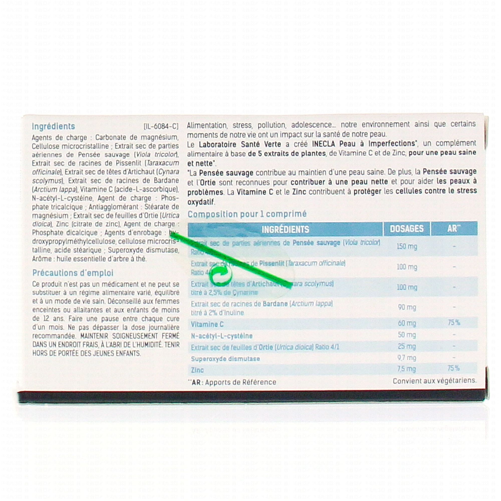SANTE VERTE peau à imperfections 30 comprimés contient les éléments suivants :