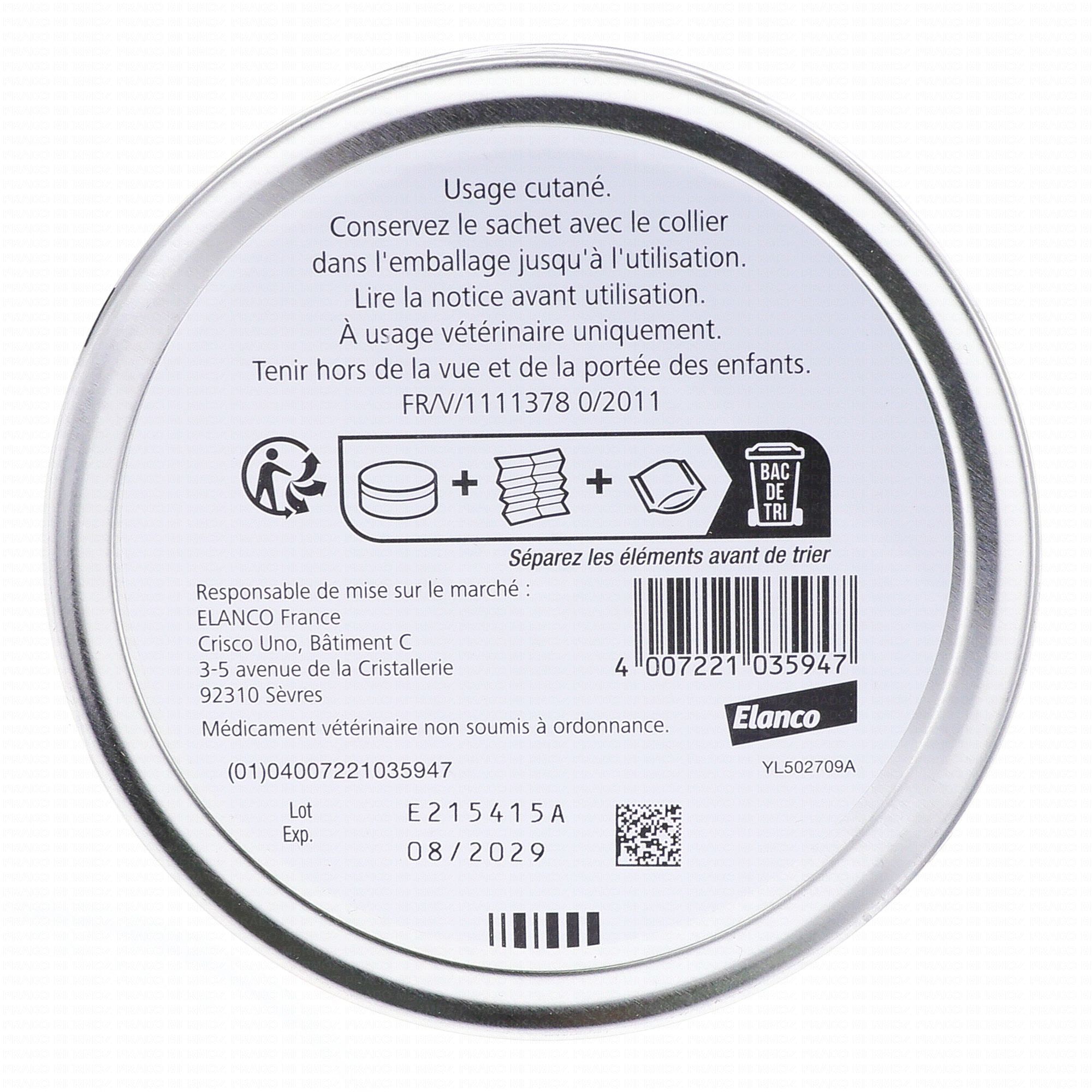 Voie d'administration : externe. Le collier doit être porté sans interruption durant la période de protection de 8 mois. L'ajustement du collier est à vérifier périodiquement. Ne pas utiliser chez les chatons de moins de 10 semaines, les chattes gestantes et les chattes allaitantes. Ce produit est toxique pour les poissons et autres organismes aquatiques. Ne pas laisser les jeunes enfants jouer avec le collier, ni le mettre à la bouche. Ne pas laisser l'animal dormir dans votre lit. Se laver les mains à l'eau froide après avoir mis en place du collier.