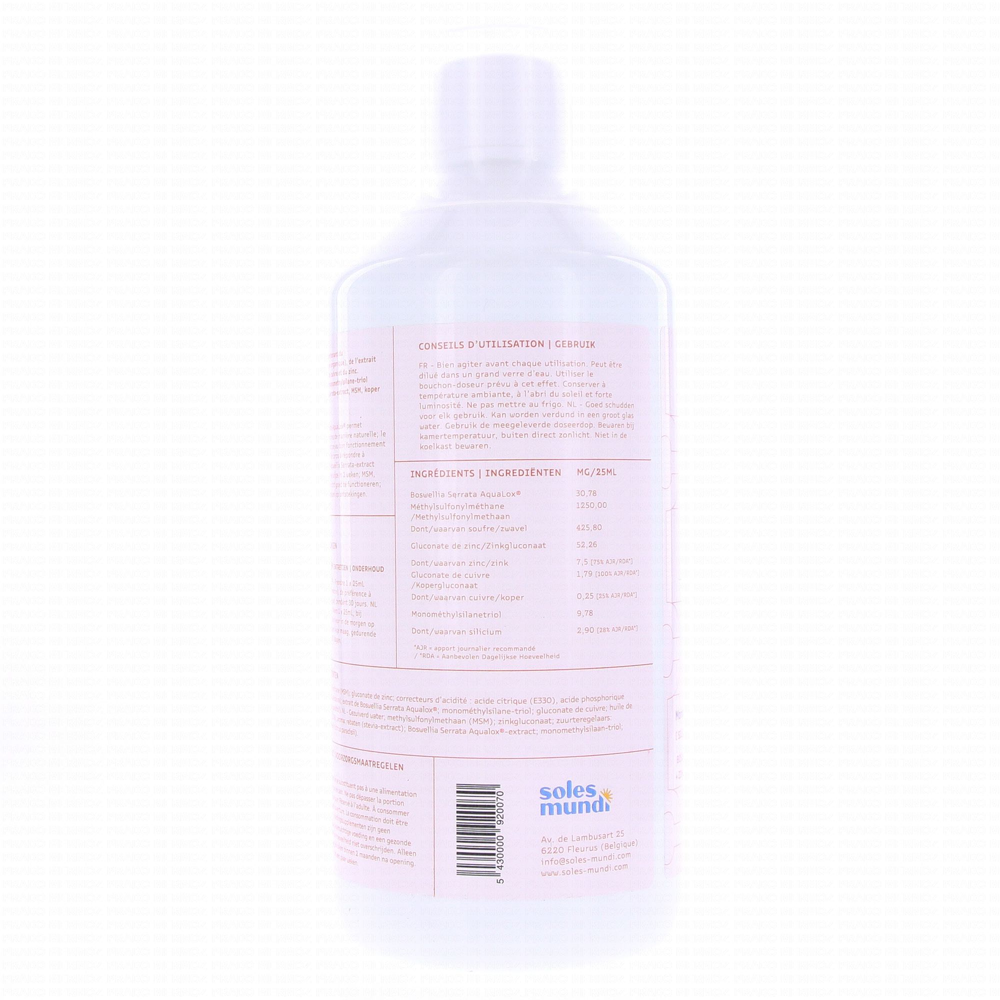Eau purifiée, méthylsulfonylméthane (MSM), gluconate de zinc, correcteur d'acidité : acide citrique (€330), acide phosphorique (E338), arôme : rébaten (extrait de stévia), extrait de boswellia serrata aqualox, monométhylsilane-triol, gluconate de cuivre, huile de pépins de pamplemousse (citrus paradisii).