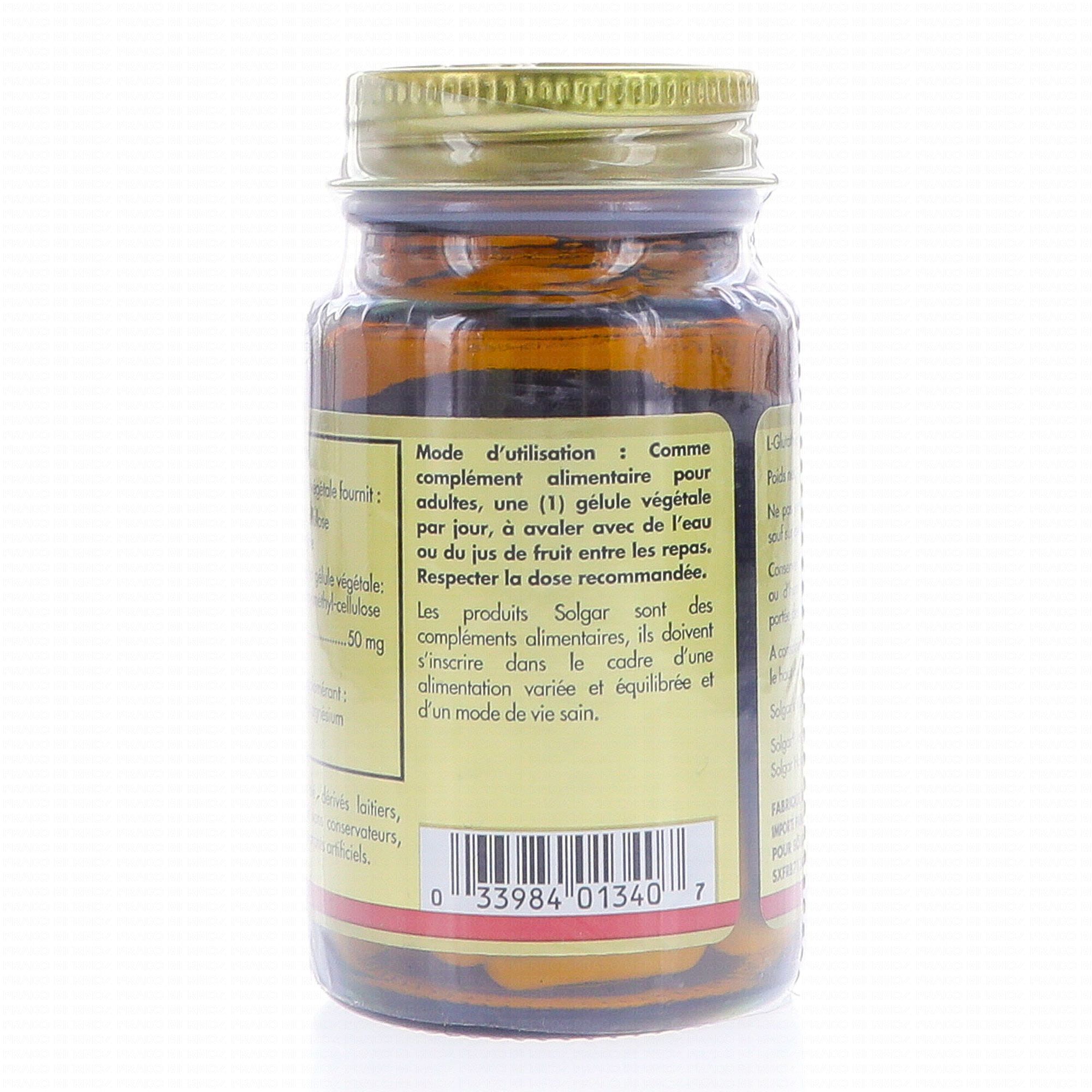 SOLGAR L glutathione 50mg 30 gélules est un complément alimentaire qui contribue à réguler et régénérer les cellules immunitaires et agent détoxifiant. Lutte contre les radicaux libres en les neutralisant. Renforce l'élimination des toxines : limite le stress oxydatif au sein de l'organisme. Convient aux végétariens. Kasher. Sans gluten, blé, dérivés laitiers, soja, levure, sans conservateurs, arômes, ou colorants artificiels.