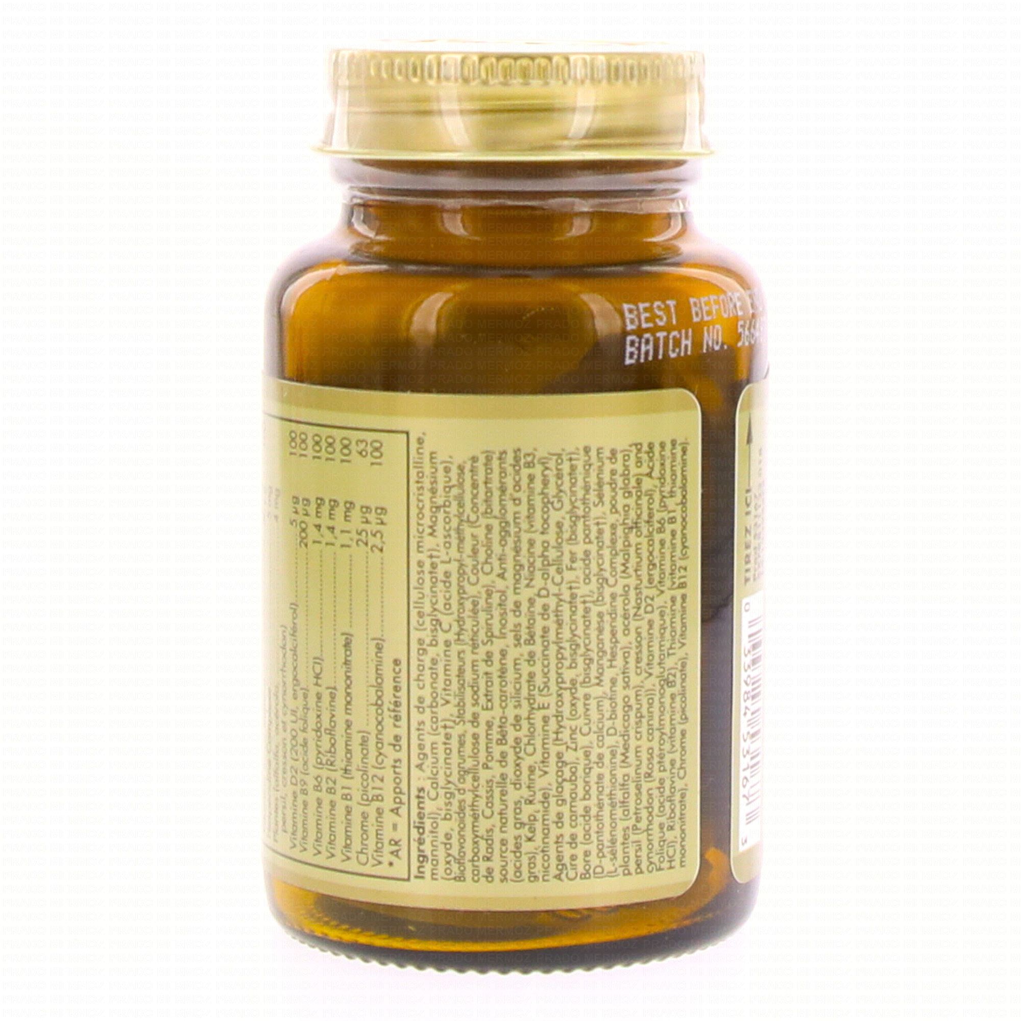 SOLGAR Multi 1 est un complément alimentaire multivitamines et minéraux complet. Il contient les vitamine du groupe B, de la vitamine C, de la vitamine D et de la vitamine E. Il contient également des minéraux comme le sélénium, le zinc, l'iode ou encore du fer. Il contribue à réduire la fatigue grâce au fer, au magnésium et aux vitamines B2, B3, B5, B6, B12 et C