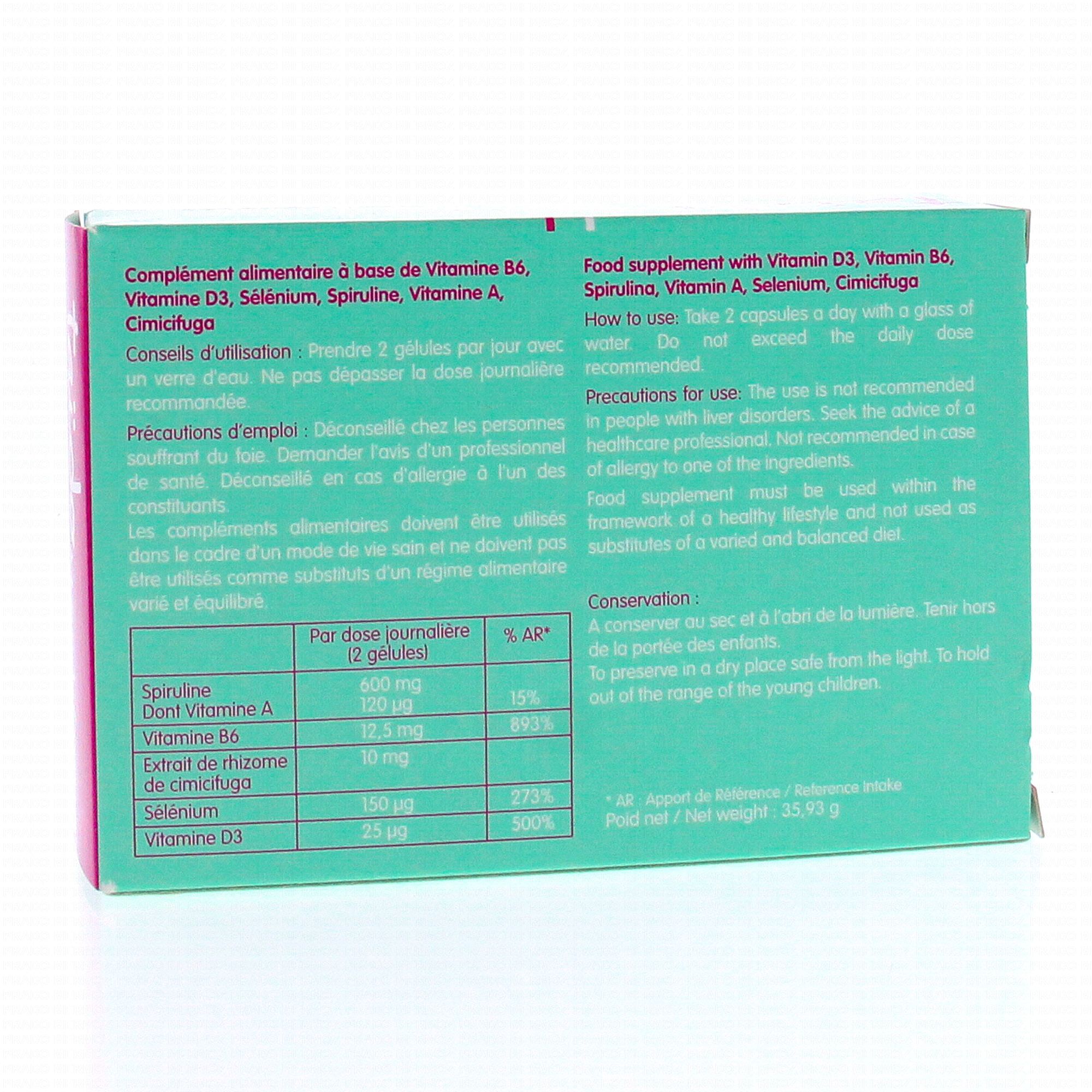 Poudre de spiruline (Spirulina platensis), maltodextrine, gélule végétale (agent d'enrobage : hydroxypropylméthylcellulose), antiagglomérant : sels de magnésium d'acides gras ; chlorhydrate de pyridoxine (vitamine B6), extrait de rhizome de cimicifuga (Cimicifuga racemosa), sélénite de sodium (sélénium), cholécalciférol (vitamine D3).