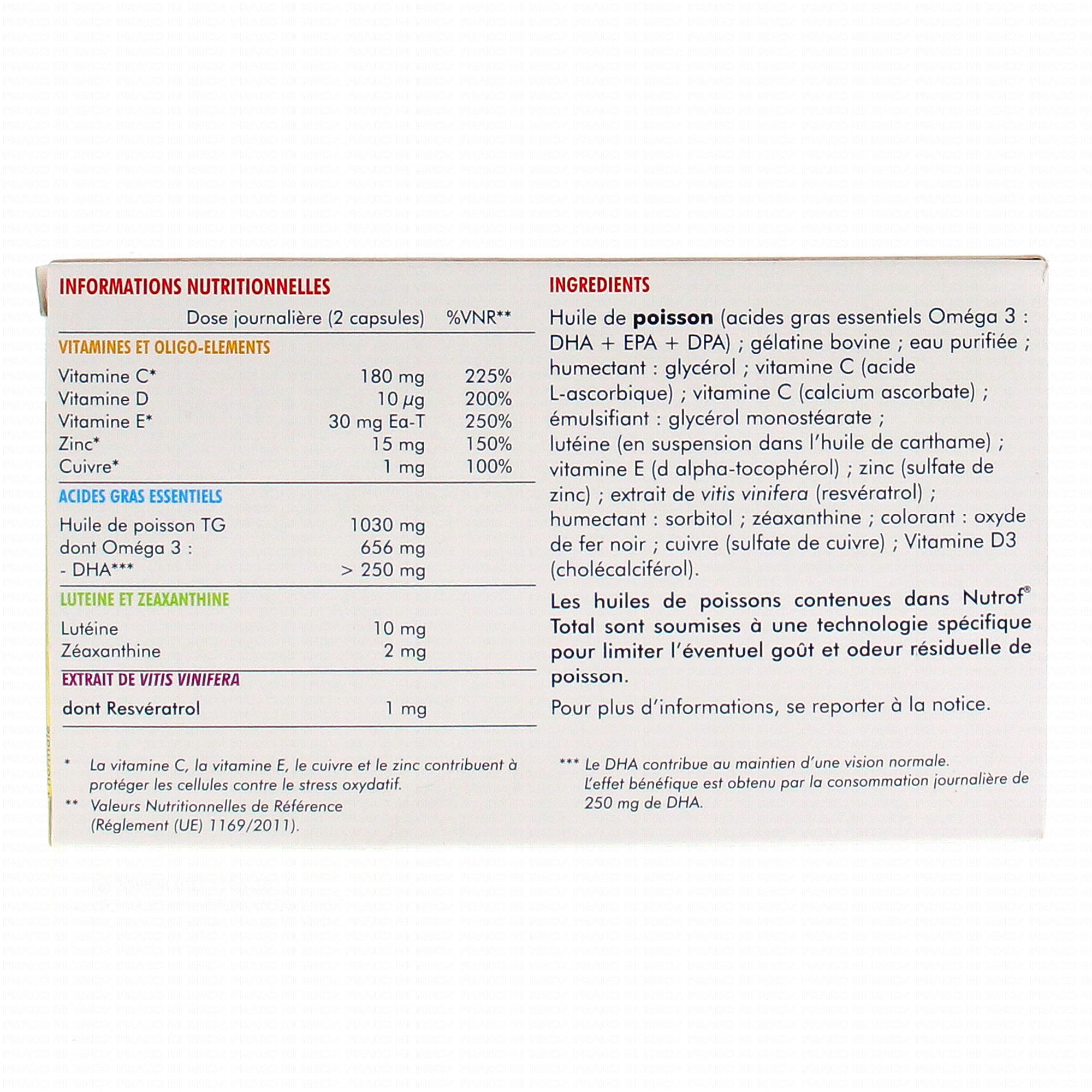 Huile de poisson (acides gras essentiels oméga 3), gélatine bovine, eau purifiée, vitamine C (acide ascorbique), émulsifiant :glycérol monostéarate, humectant : sorbitol, épaississant : glycérol, lutéine, zéaxanthine, huile de carthame, vitamine E (d alpha-tocophérol), zinc (sulfate de zinc), extrait de Vitis vinifera (resvératrol), zéaxanthine, huile de carthame, colorants : oxyde de fer noir, oxyde de fer rouge, cuivre (sulfate de cuivre).