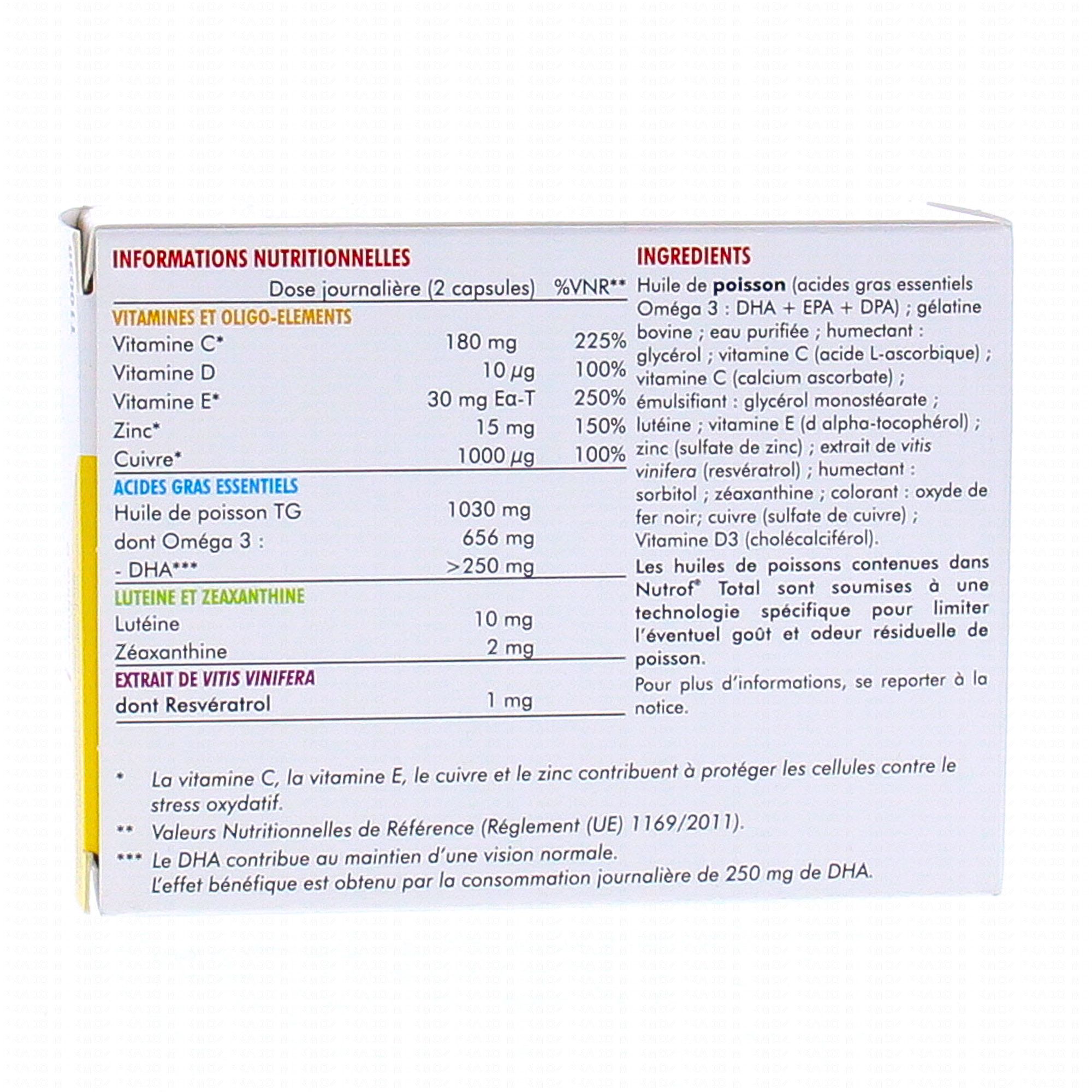 Huile de poisson (acides gras essentiels oméga 3), gélatine bovine, eau purifiée, vitamine C (acide ascorbique), émulsifiant :glycérol monostéarate, humectant : sorbitol, épaississant : glycérol, lutéine, zéaxanthine, huile de carthame, vitamine E (d alpha-tocophérol), zinc (sulfate de zinc), extrait de Vitis vinifera (resvératrol), zéaxanthine, huile de carthame, colorants : oxyde de fer noir, oxyde de fer rouge, cuivre (sulfate de cuivre).