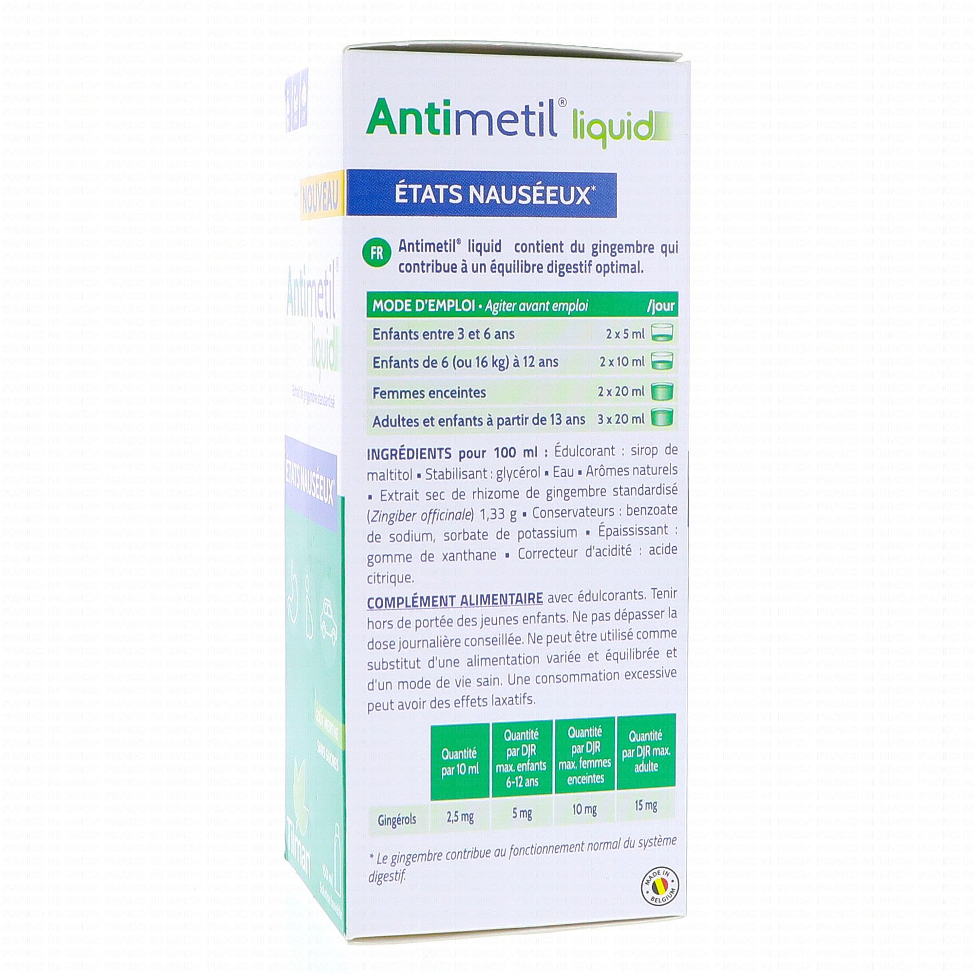 En cas de voyage ou déplacement, prendre Antimetil Liquid 30 minutes avant le départ.